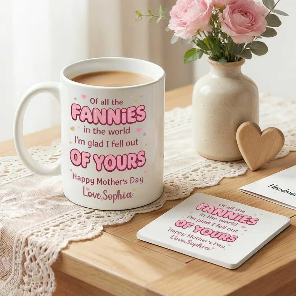 Moms who love fun are pure gems. Our beautiful Ceramic Mug with Name and Coaster that says “of all the fannies in the world, I’m glad I fell out of yours,” is not only a gift. It is a funny but warm way to say mom i love you. You can select the size of your choice and get it customized with her favorite color and your name.