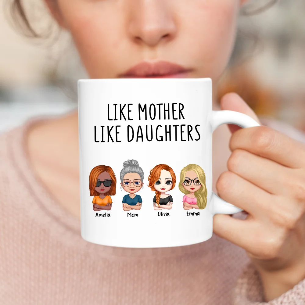 Have you ever heard your relatives saying ” mother like daughters”? If yes, this pick will result in a big smile on your mom’s face. Our Personalized Like Mother Like Daughter White Ceramic Mug not only has beautiful text but also comes with various customizable options. You can select the number of daughters, the size of the cup, hair color, and more.