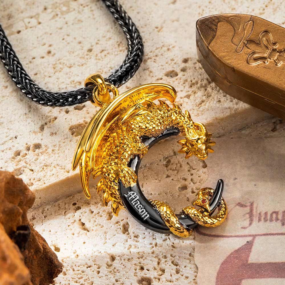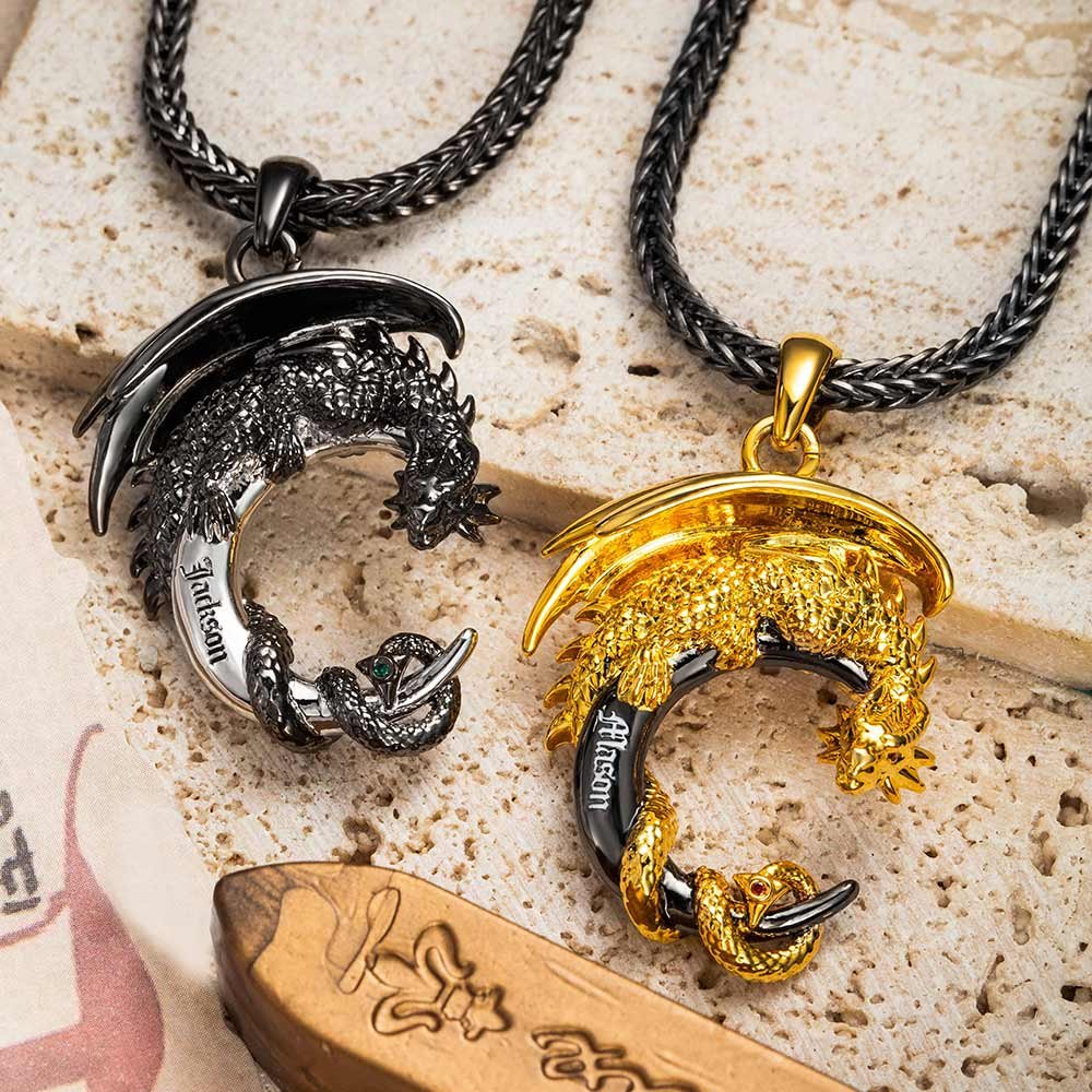 Personalized Medieval Gothic Moon Dragon Name Necklace with Foxtail Chain Father’s Day Birthday Gift for Men
