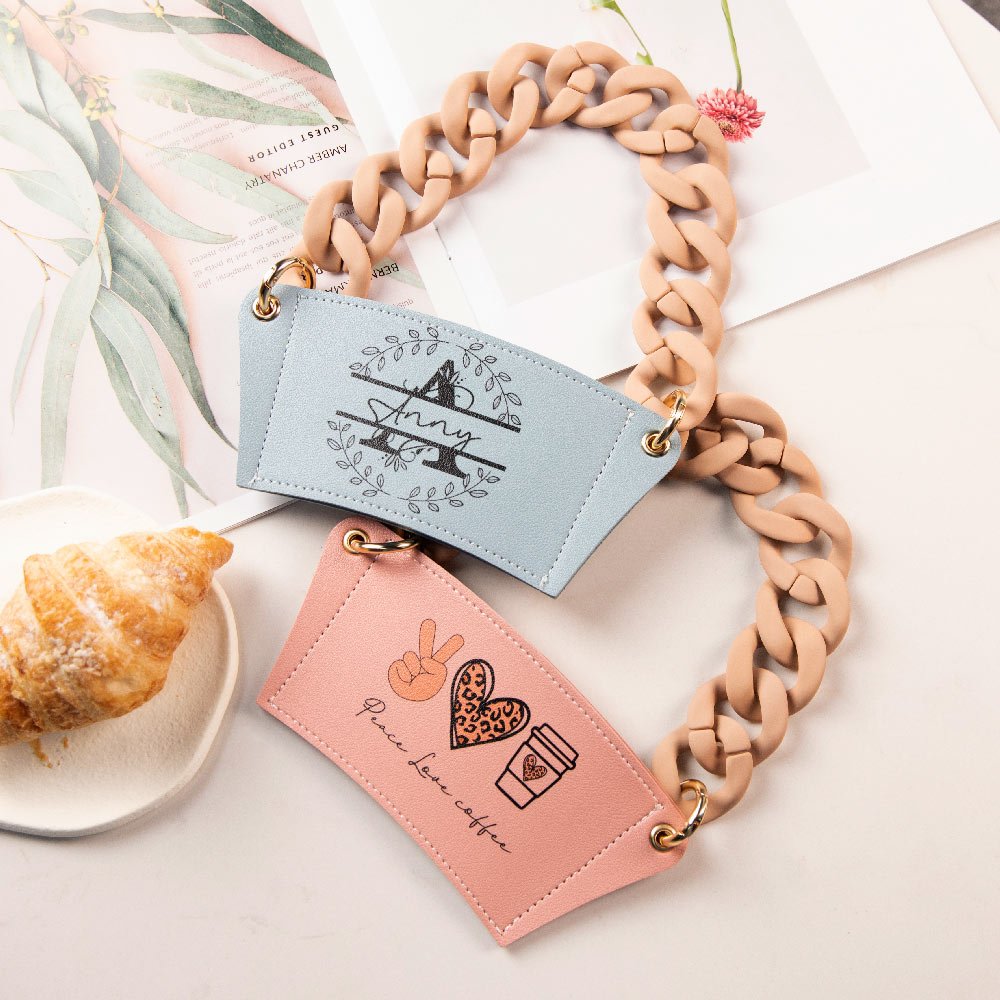 The Leather Coffee Sleeve with Chain is designed to helping you holding your morning coffee and afternoon tea. Coffee chain holder can hang on the stroller, car back seat, bicycle, convenient and portable,which free your hands to carry other items.