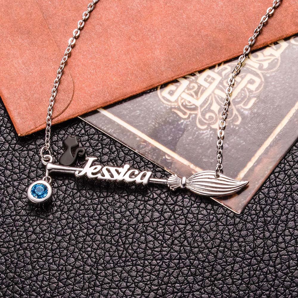 The necklace can be customized with your name and birthstone, adding a personal touch to the whimsical Halloween theme.