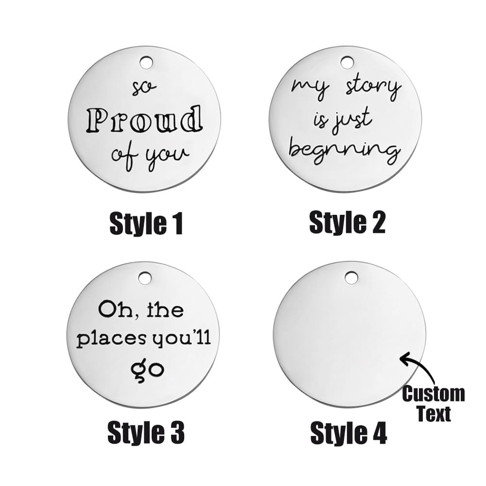 This personalized photo charm allows you to customize your photo as well as text on the round disc. You can attach it to the graduation cap or bride's bouquet, serving as a touching tribute to and remembrance of your lost loved ones.