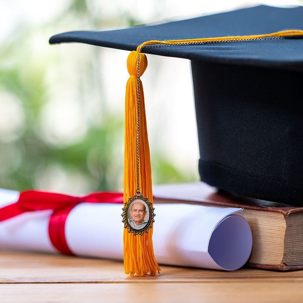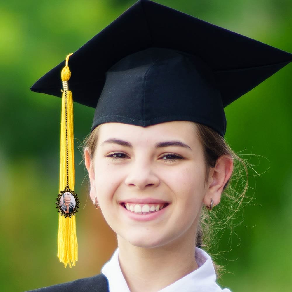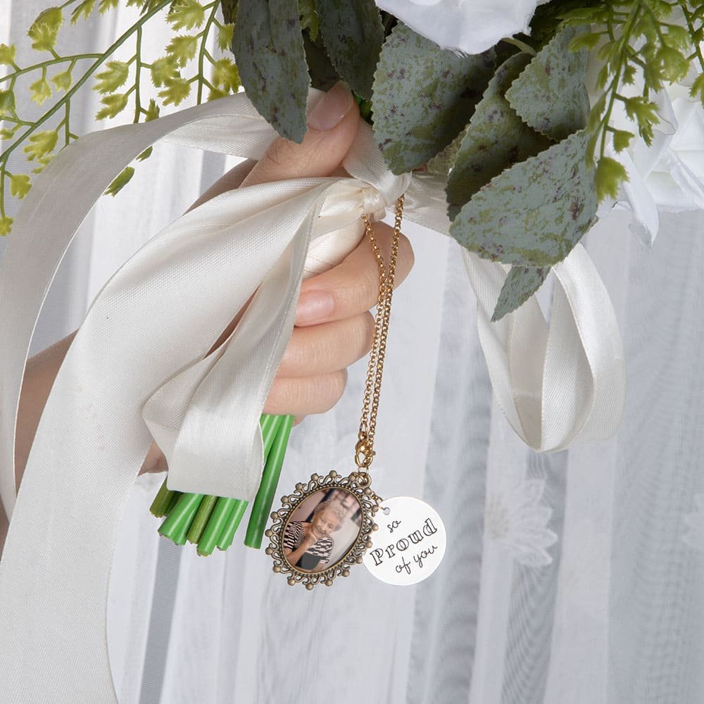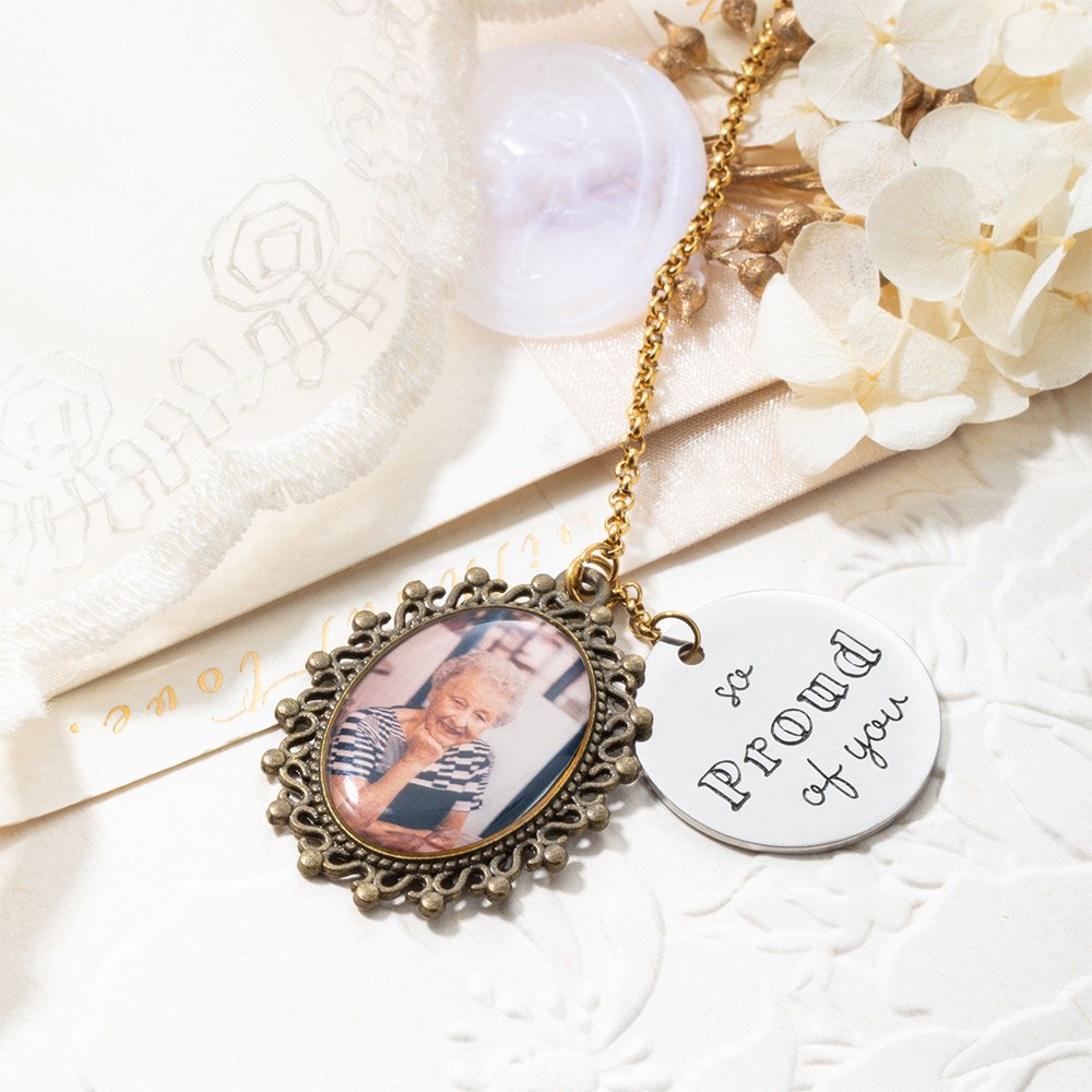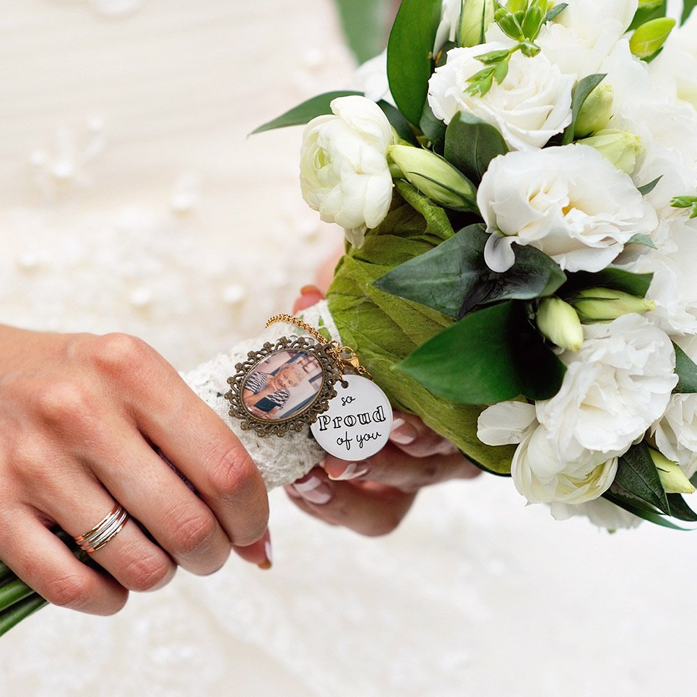 Add a photo of your loved one who cannot attend your graduation or wedding, then tie it to your graduation cap or wedding bouquet to keep her/him close to you on your special day. The custom charm is the perfect way to honor late relatives on your big day.