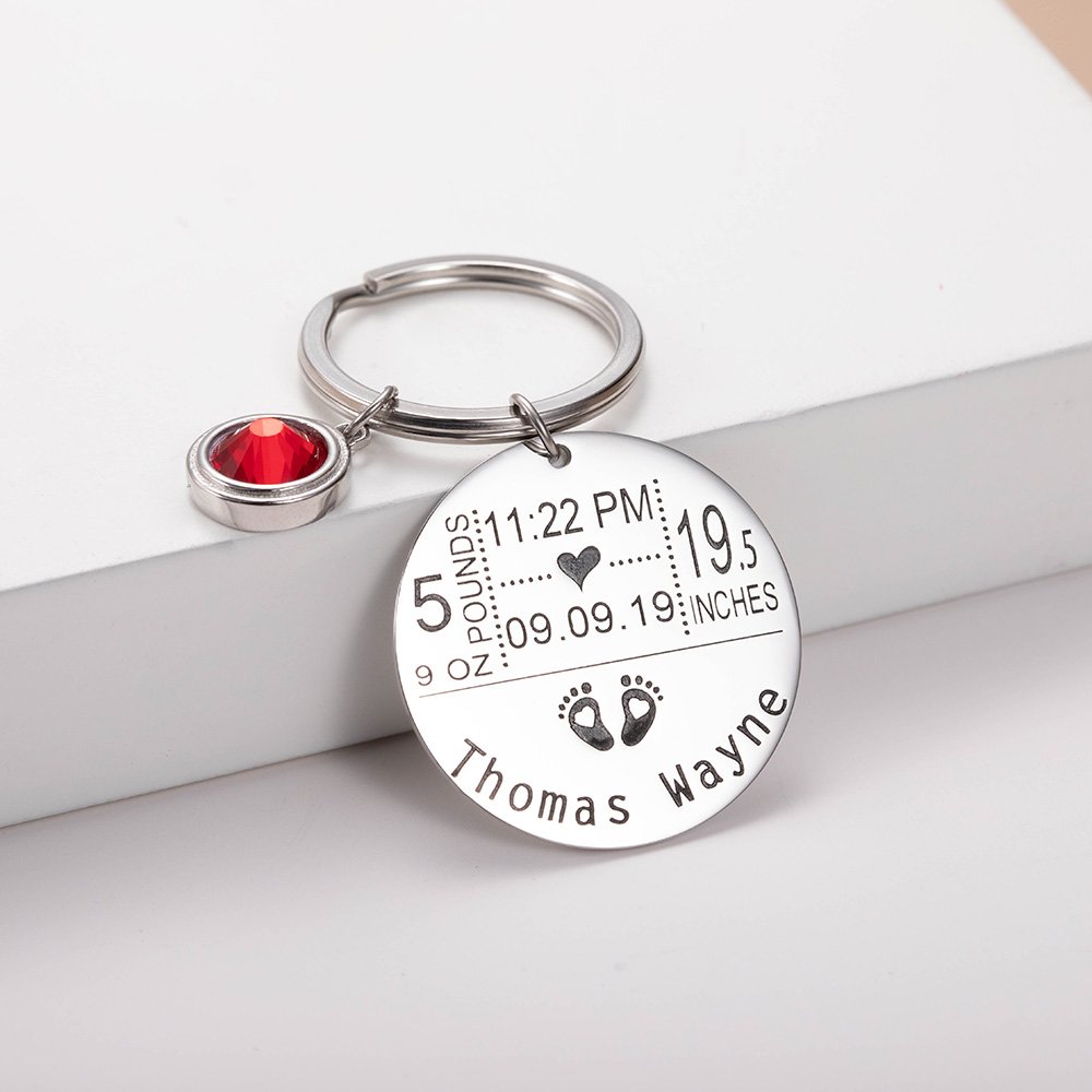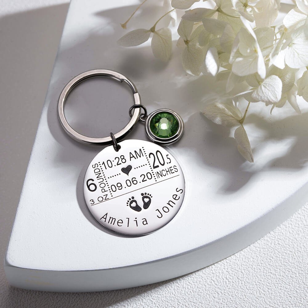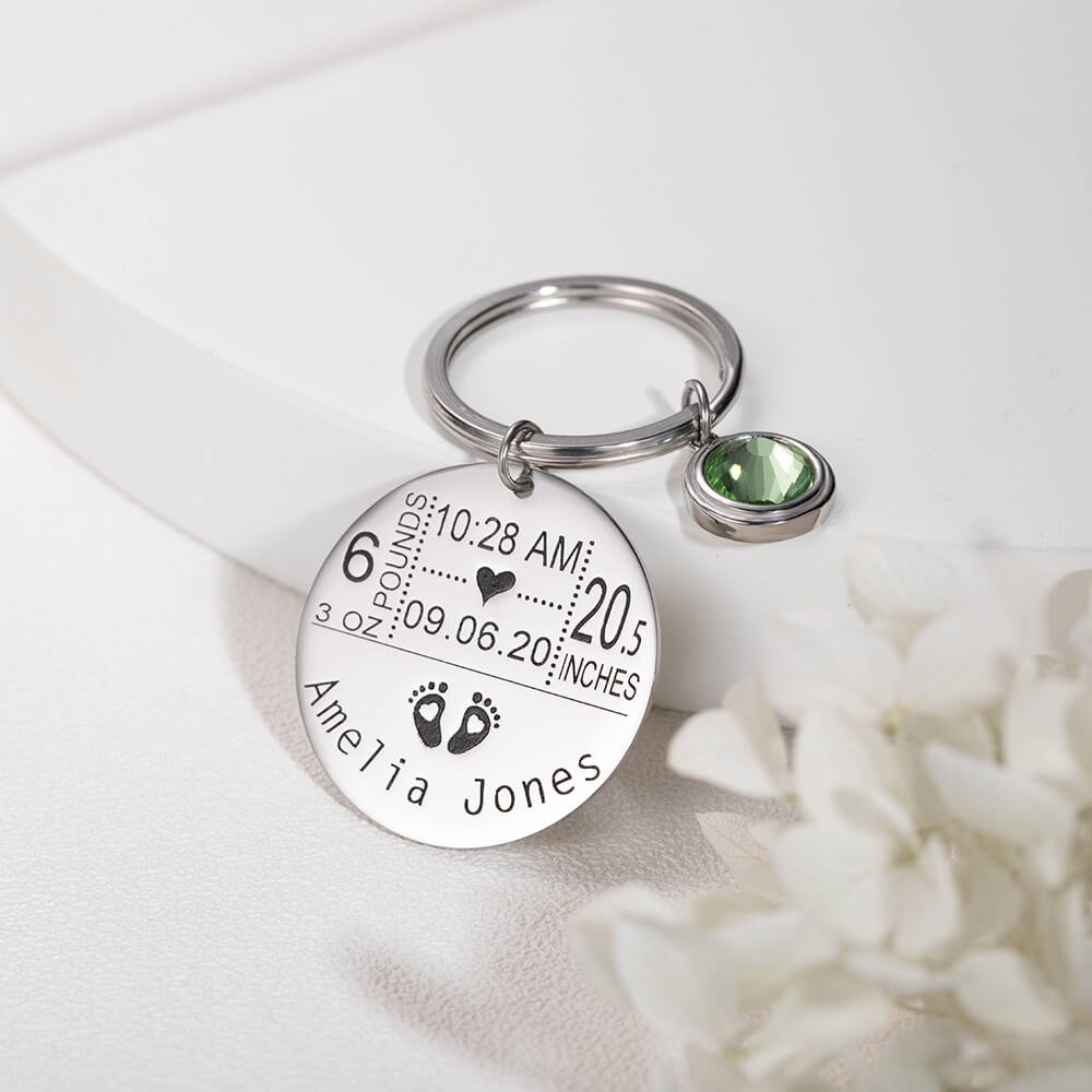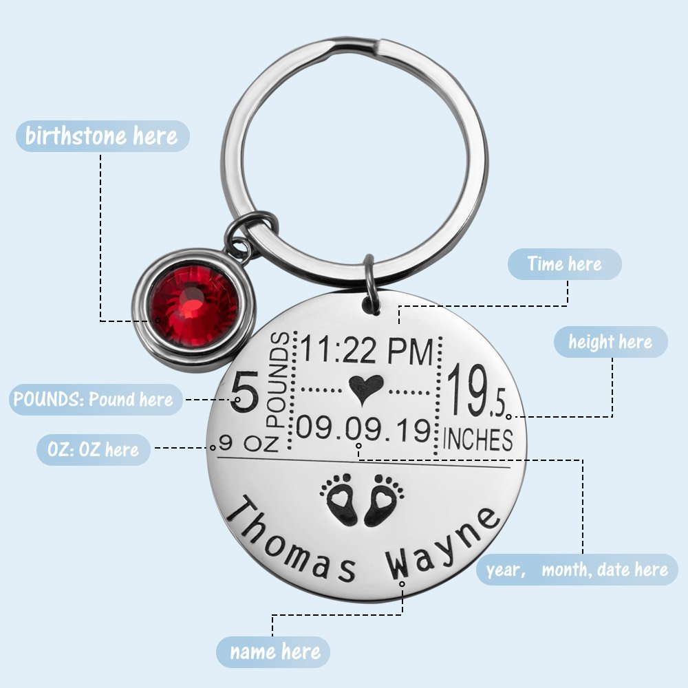 •This keychain by Callie is designed for a new mom or new dad which includes the baby’s birthstone, birthday, birth time, weight, and height to remember for life long.