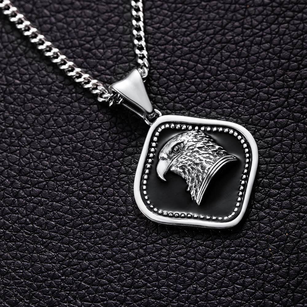 • This is an old eagle pendant made of 925 silver. The eagle necklace with an embossed surface design. Callie designers chose the eagle as the pattern because it is a symbol of a soldier, a father, or a man. The shape of the pendant is similar to a square. In fact, its outer frame is made of two infinite curves, which are regular but uncommon, just like INFINITE. This chain is a lobster chain, and the back can be engraved with the words you want to show, making this necklace even more unique.
