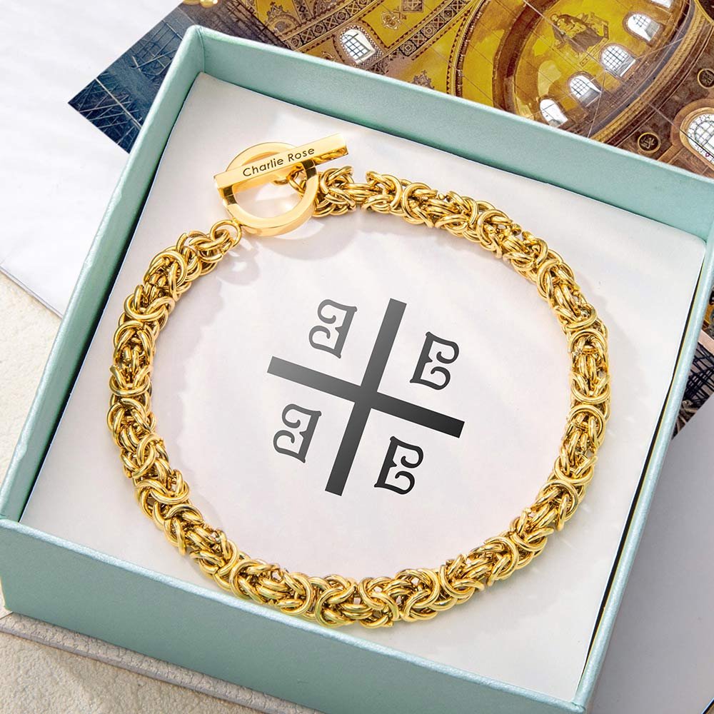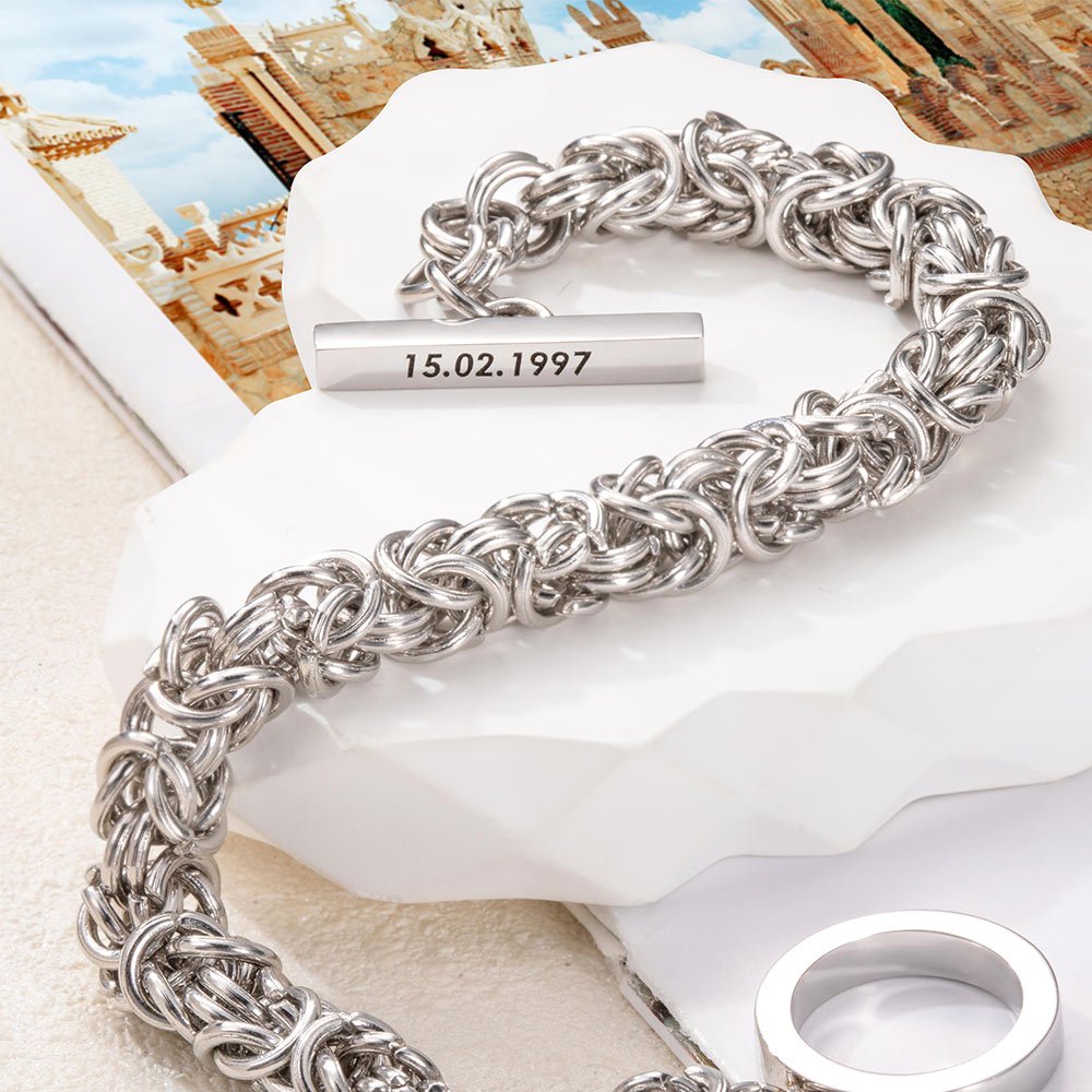 This decorative bracelet is available in silver or gold-plated, and we’ll personalise the T-Bar closure with a special date or name.