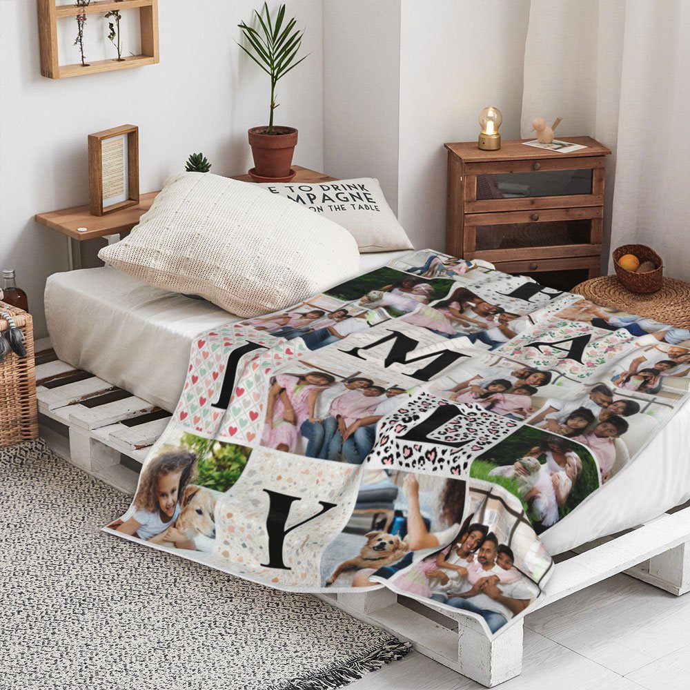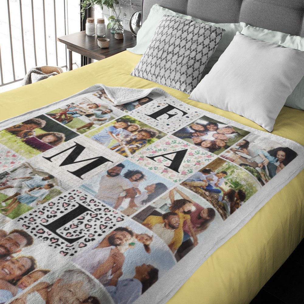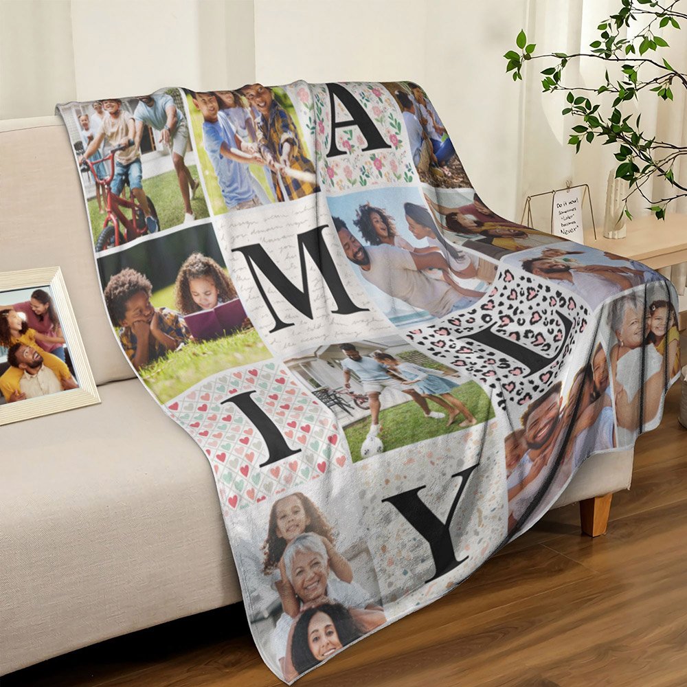 This blanket uses 14 warm family portraits as design elements, stitching together multiple beautiful moments, and matching "Family" with a variety of patterns. The overall design is cute and full of warmth, intuitively showing the deep affection between the family.