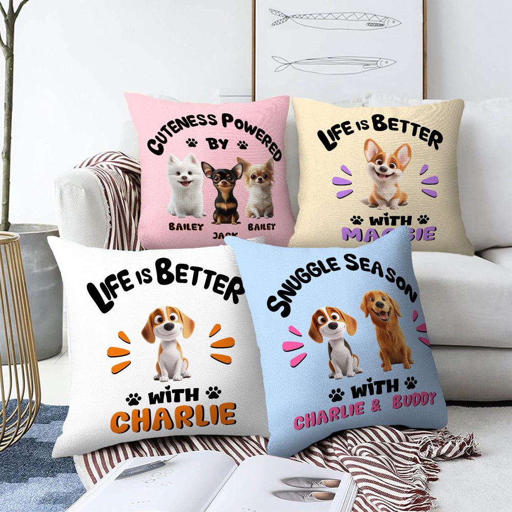 This pillowcase can be customized with 1-3 3D cartoon dogs as its core design element. The lively and agile puppy image comes alive on the fabric, its eyes full of inspiration, conveying the warmth of companionship. Optional text design features such as "Life is better with", "Snuggle season with", and "Cuteness powered by" along with personalized inscriptions of your pet's name, instantly transform the pillow into a vehicle for personalization and emotion, injecting a touch of cuteness into your home.