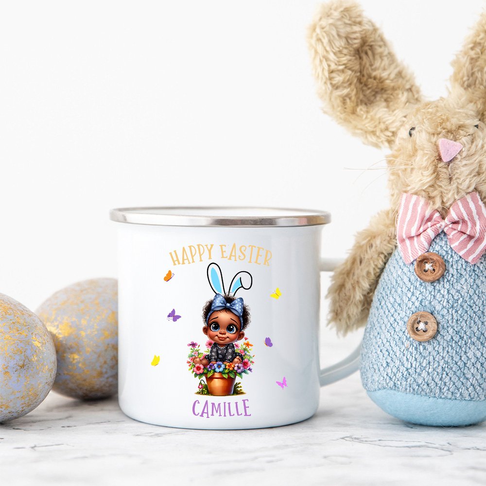 This enamel mug is designed with bright colors and 3D cartoon characters as the core, printed with cute children's images. The child sits on the flower pot, like a flower baby, vivid and interesting. The title "Happy Easter" is very festive, and you can also personalize your child's name on it to make the water bottle unique.