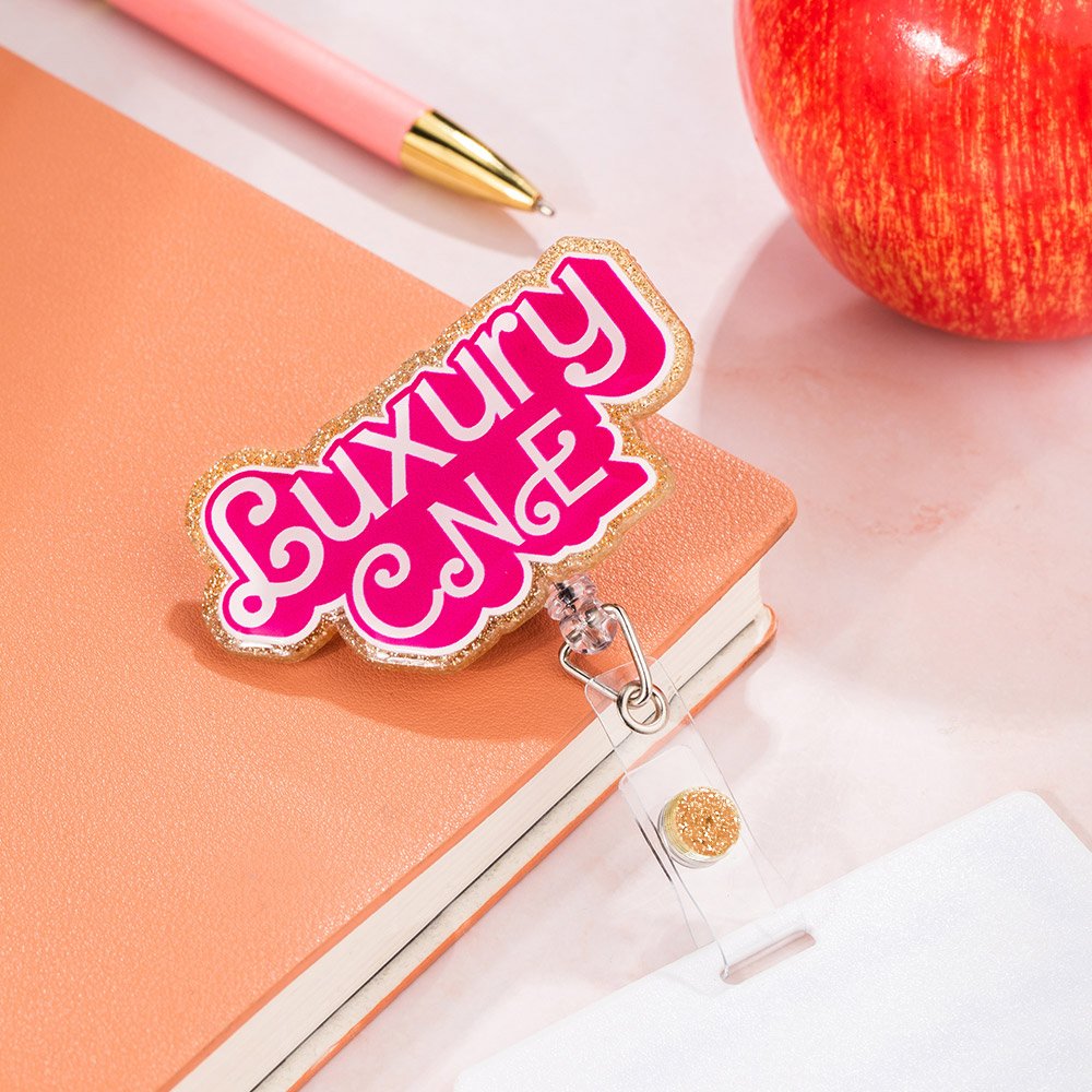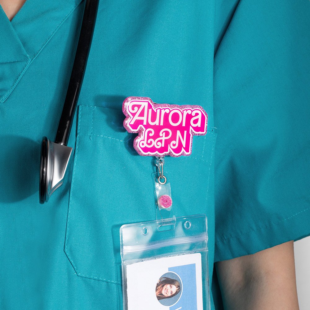 The badge reel features a specially designed pink doll-themed color scheme and font, making it a fashionable accessory that stands out from the crowd.