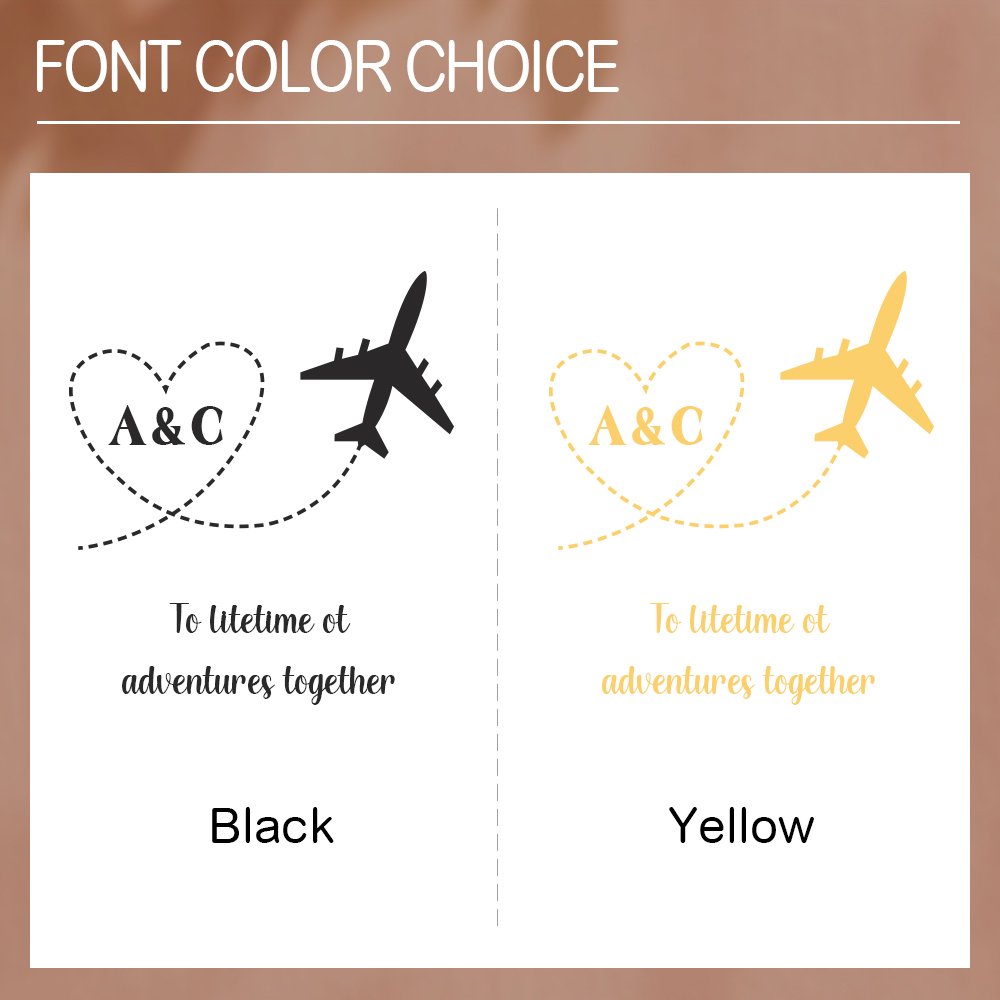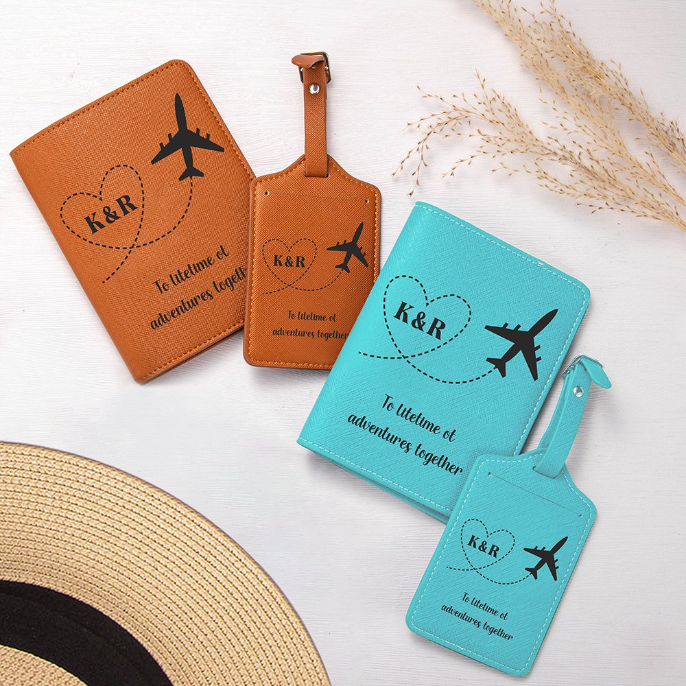 Our passport holder and luggage tag feature a charming airplane heart route design with a starting point icon, airplane illustration, and initials. You can add your and your partner's initials to make them unique and show your love for travel and adventure.