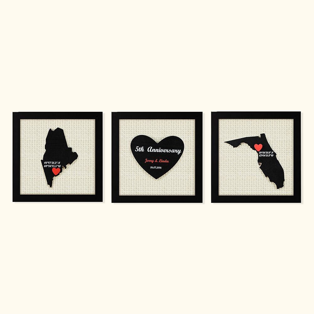 This is a set of three-piece photo frame map wall decorations. The state maps of the birthplaces of the two people are respectively placed. The maps are printed with the latitude and longitude of the specific address and exclusive location information. The number of anniversaries printed with the love in the middle, the name and date of commemoration can be customized.