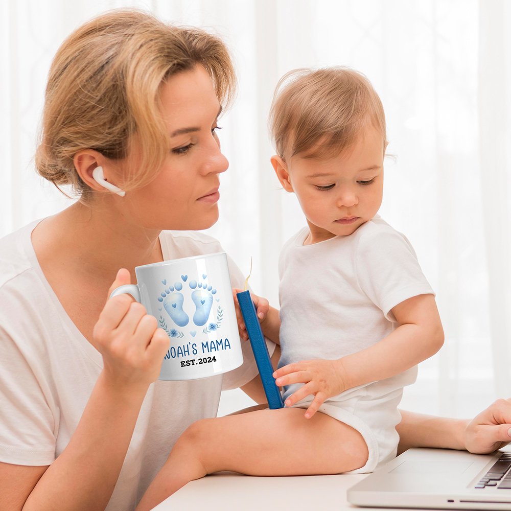 This beautifully designed ceramic mug features a delicate pink or blue baby footprint, personalized with the baby's name and birth year. It serves as a heartfelt keepsake, capturing the joy of welcoming a newborn into the family.