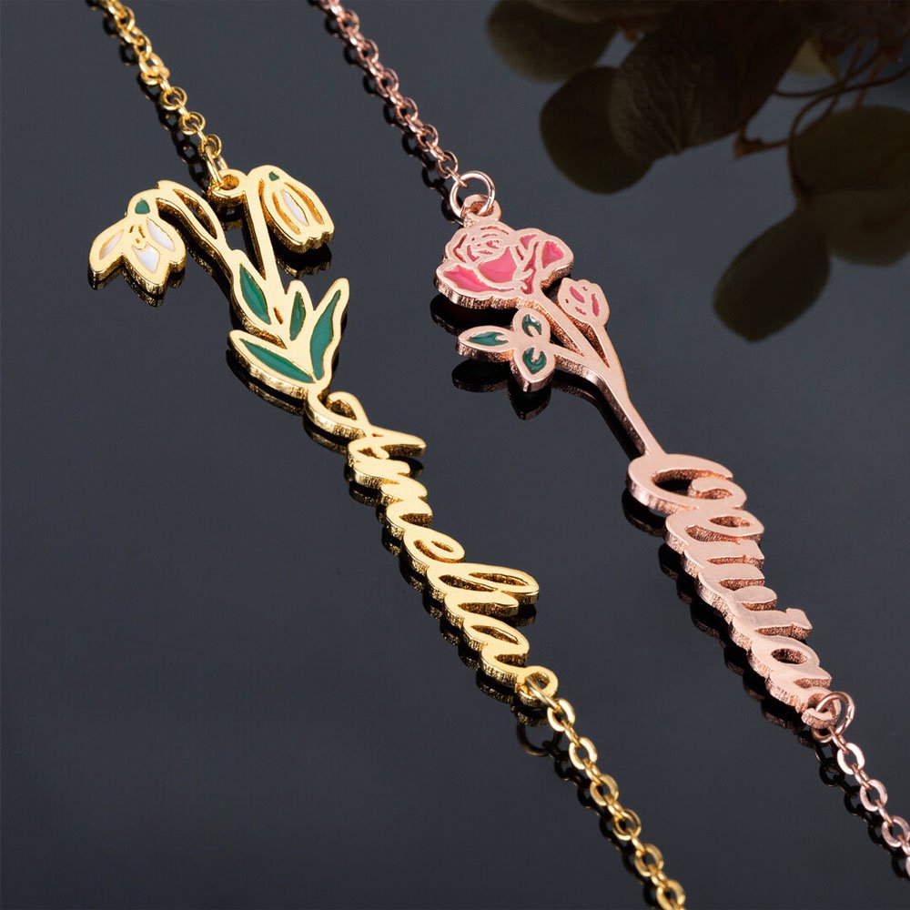 Introducing our necklace - a masterpiece of sentiment and style. This necklace features vibrant birth flowers and birthstones, with the added touch of the customizable sideways name. Combining colorful birth flowers, names, and prominent birthstones creates an elegant and meaningful minimalist jewelry piece.