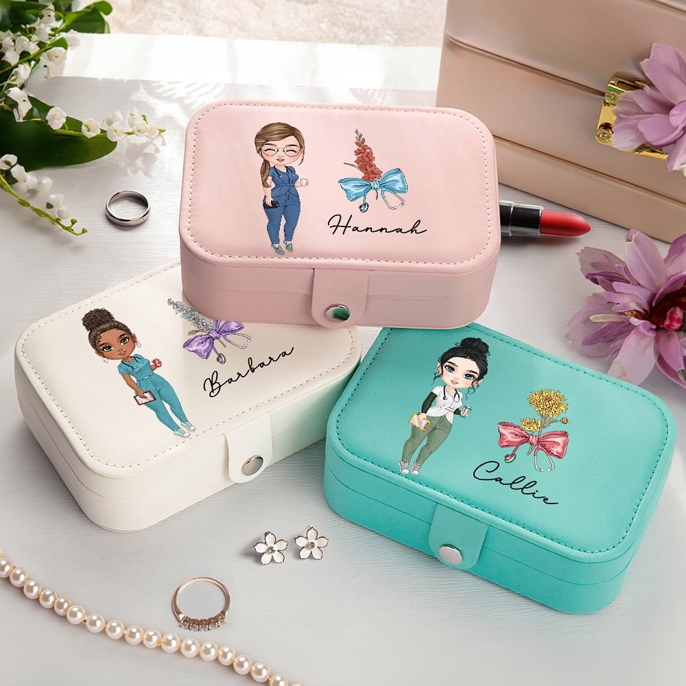 This personalized jewelry box features a beautiful blend of birth flowers, a stethoscope bow, and a charming female medical character. It can also be customized with a name to express individuality while also honoring the dedication of healthcare professionals, making it a truly special gift.