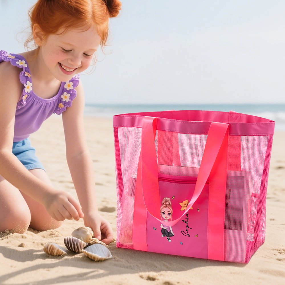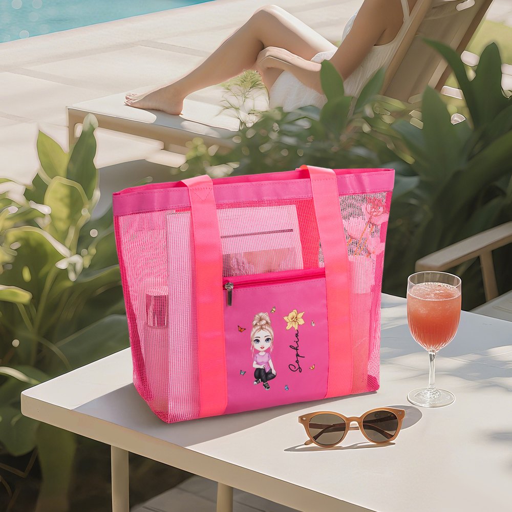 This mesh beach tote bag is inspired by the flowers that represent the months, and is combined with cute cartoon characters for a customized look. Each tote bag is not only available in three bag colors: pink, rose pink, and blue, but can also be customized according to the customer's name, making it a unique summer item.