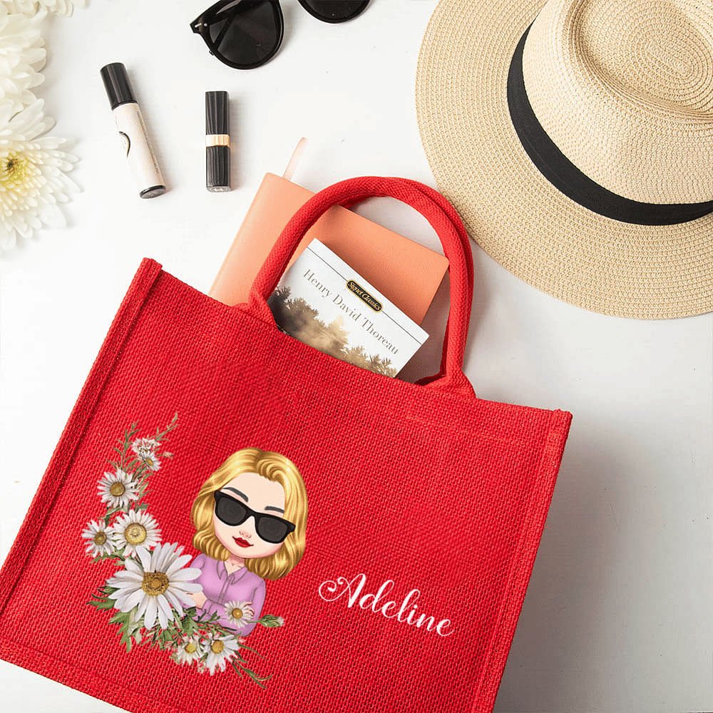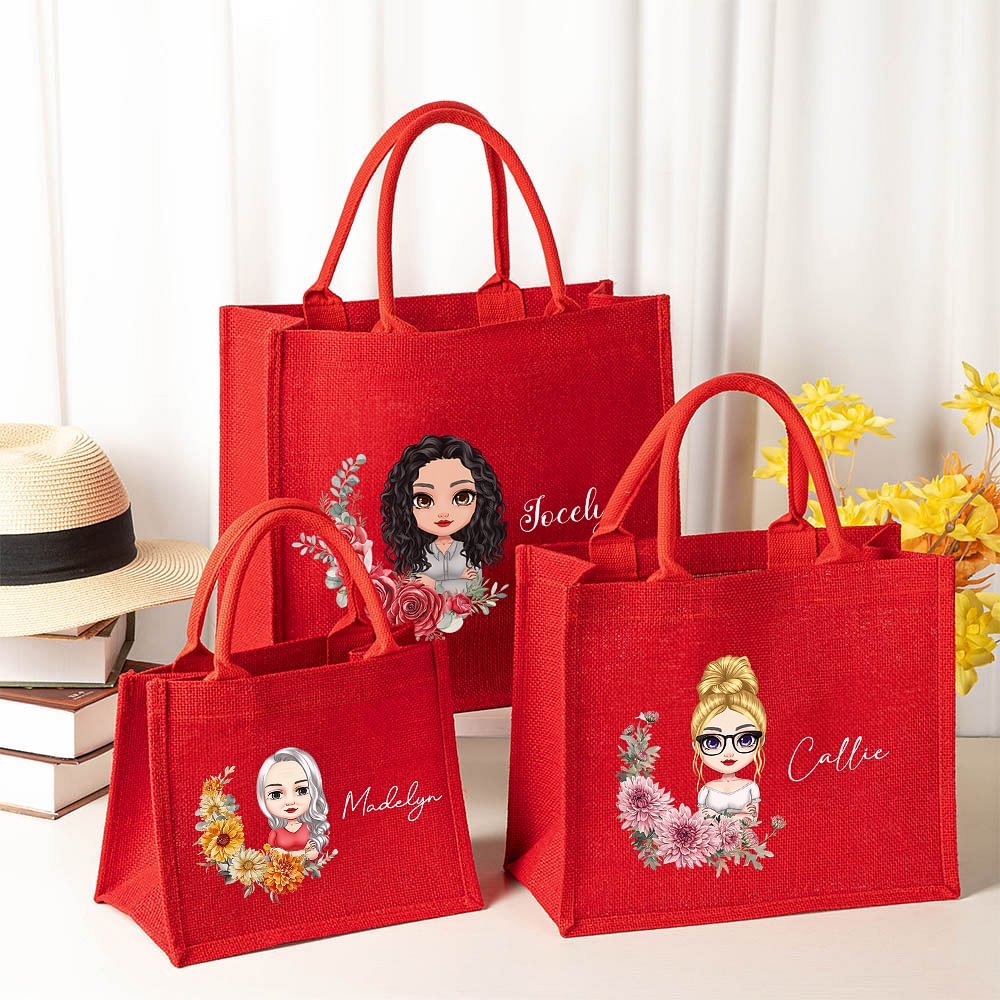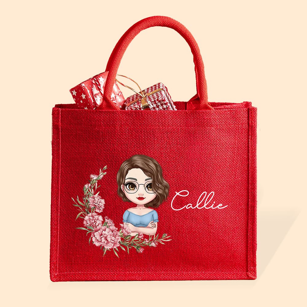 Features delightful cartoon characters interacting with birth month flowers, personalized with the recipient's name. The playful illustration combines personal birth flower symbolism with charming character art on vibrant red jute.