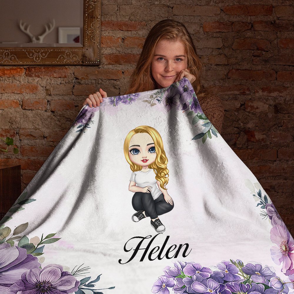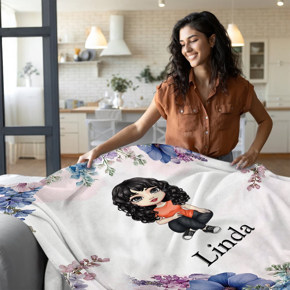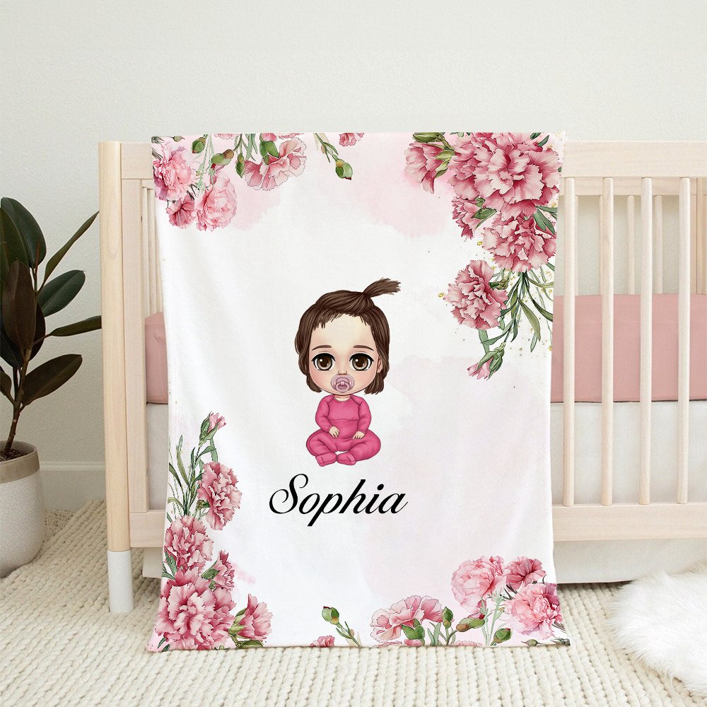 This blanket features a beautiful floral background and can be personalized with a cartoon character and its name, like baby girl, baby boy, girl, boy, woman, man.