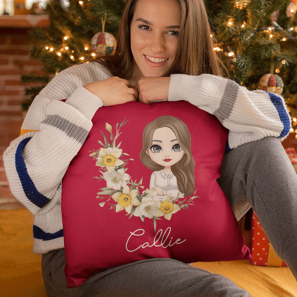 Personalized Birth Flower Wreath Cartoon Character Throw Pillow Cover with Name Home decor Birthday Family Gift for Mom Grandma