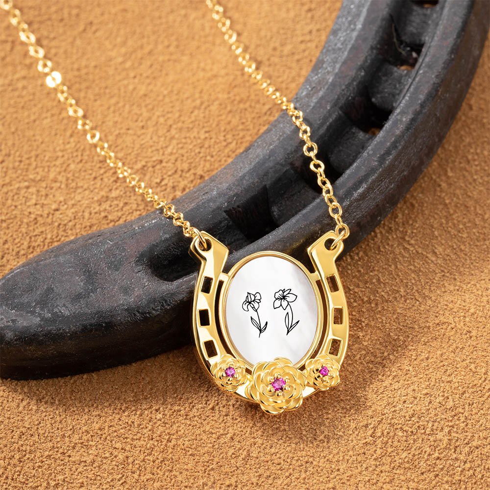This personalized necklace is a perfect gift. The horseshoe pendant, resembling a crescent moon, symbolizes eternal youth and strength in ancient Greek mythology, while the delicate flower represents the birth month of your loved one. The unique blend of these two symbols makes it an ideal gift for your mother or grandmother.