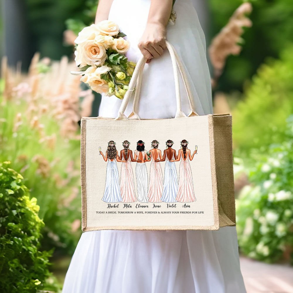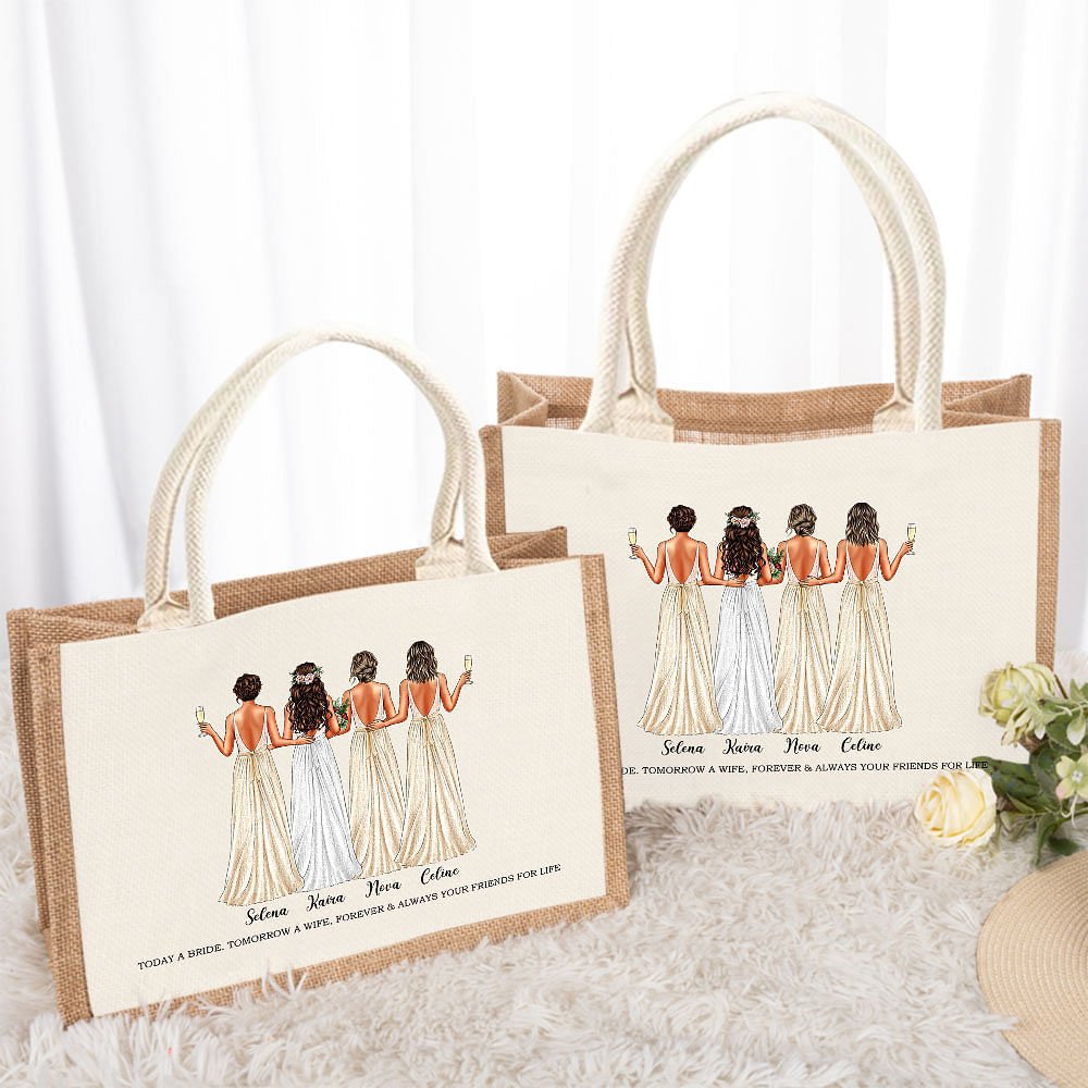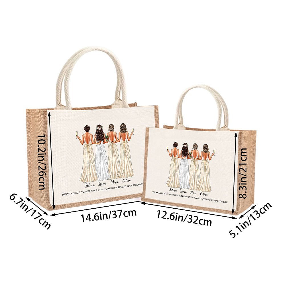 This beautifully crafted tote features a custom character design that encapsulates the joy of weddings and memorable moments with your closest friends. The delightful blessing quote adds a sentimental touch, making it the perfect accessory for bridal showers, bachelorette parties, or even everyday use. Plus, you can personalize it with the bride's and bridesmaid's name, ensuring it’s a truly unique gift that will be cherished forever. Every time the bride uses this tote bag, she’ll be reminded of the beautiful memories shared with her bridesmaids and friends.