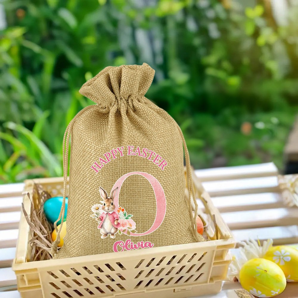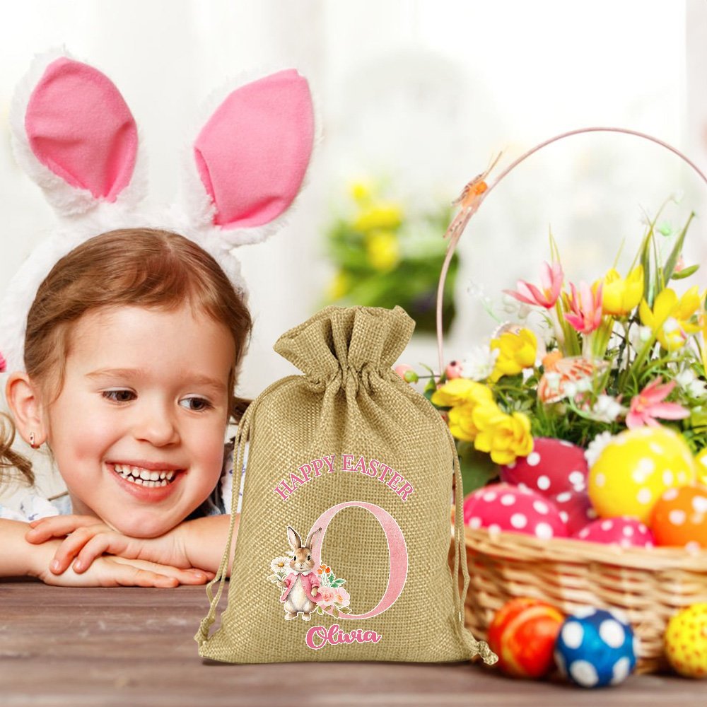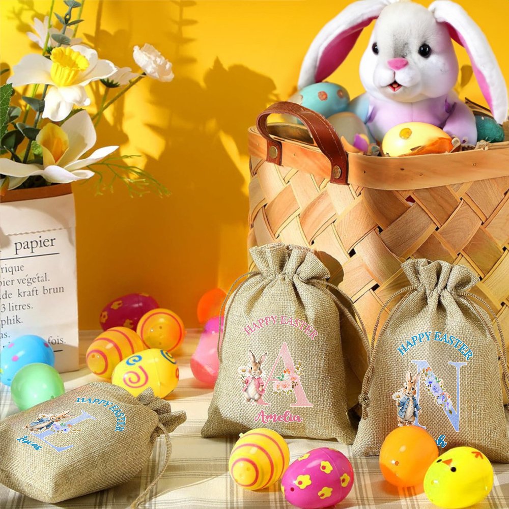 This drawstring bag can be customized with a bunny pattern in your choice of blue or pink and can be customized with names and initials to add a festive touch to any Easter event or party.