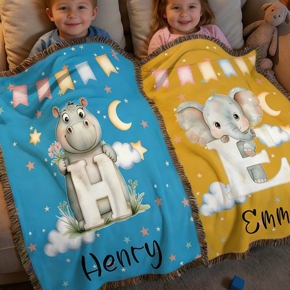This blanket features cartoon animals and personalized initials, capturing the whimsy and wonder of childhood, adding a unique touch to every child. Colorful fringes add vibrancy and texture, enhancing the blanket's visual appeal and giving it a handcrafted feel. Customizable names are subtly incorporated into the design, transforming a comfortable blanket into a precious keepsake, making it truly personal for the child.