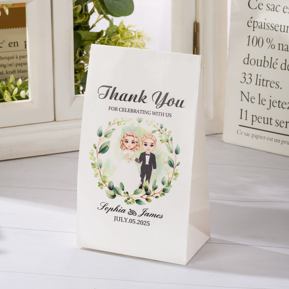 These gift bags combine personalization and romantic beauty. They can be inscribed with the newlyweds' cartoon images, names, and wedding date, surrounded by a garland of green leaves. There is also fixed text "Thank You For Celebrating With US". The bags are available in two classic colors: white and natural, adding a touch of exclusivity.