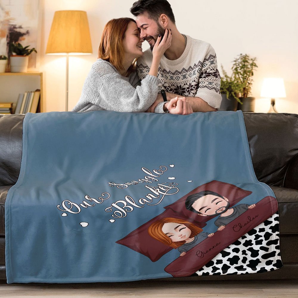 This"Our Snuggle Blanket"-themed blanket features customizable cartoon characters that are so lifelike that they seem to freeze your love story at this moment. The blanket can also be printed with your name, making it the perfect vehicle for you to express your love.