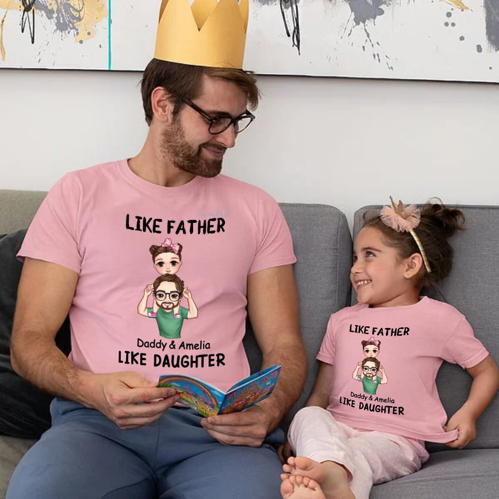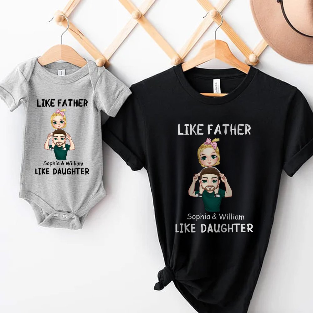 The design is based on cute cartoon father and kid characters, with the child sitting on the father's shoulders, full of safety, warmth, and happiness. You can customize the name and match it with our fixed title, "Like Father Like Daughter/Son," to create a unique holiday parent-child outfit.