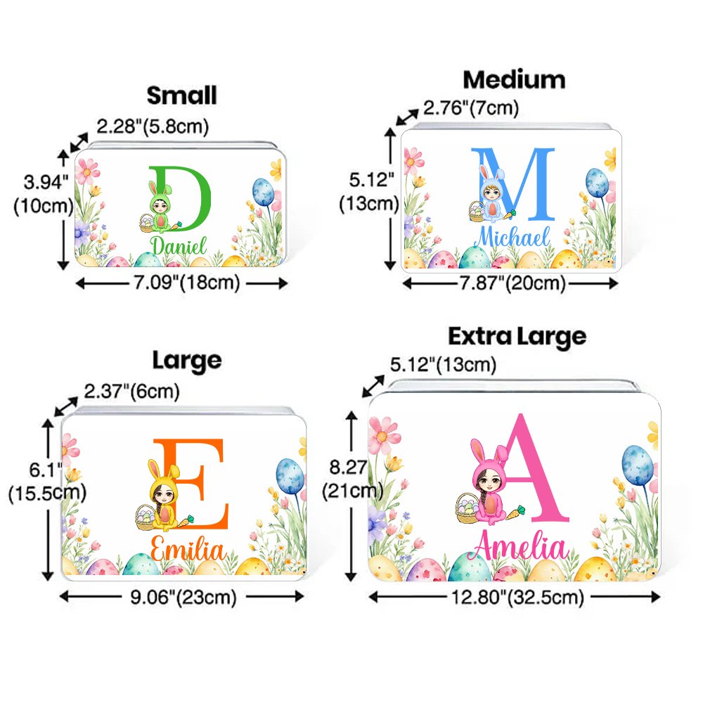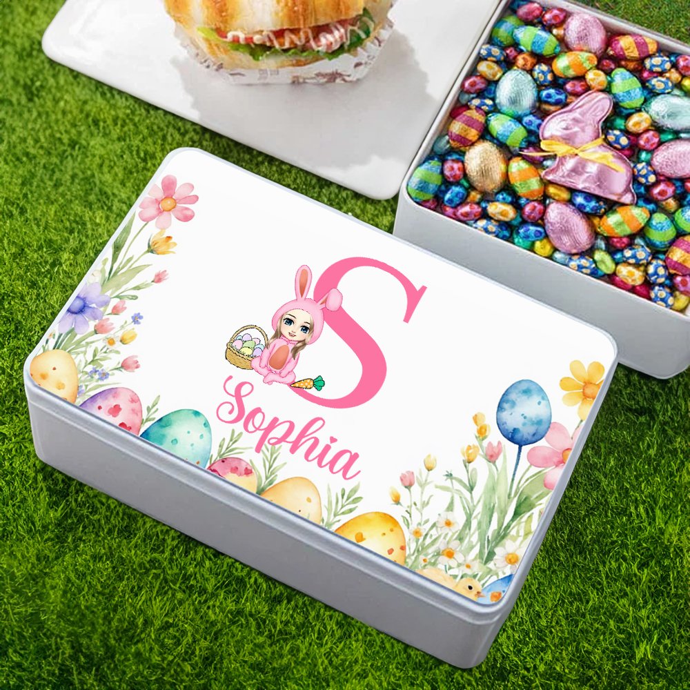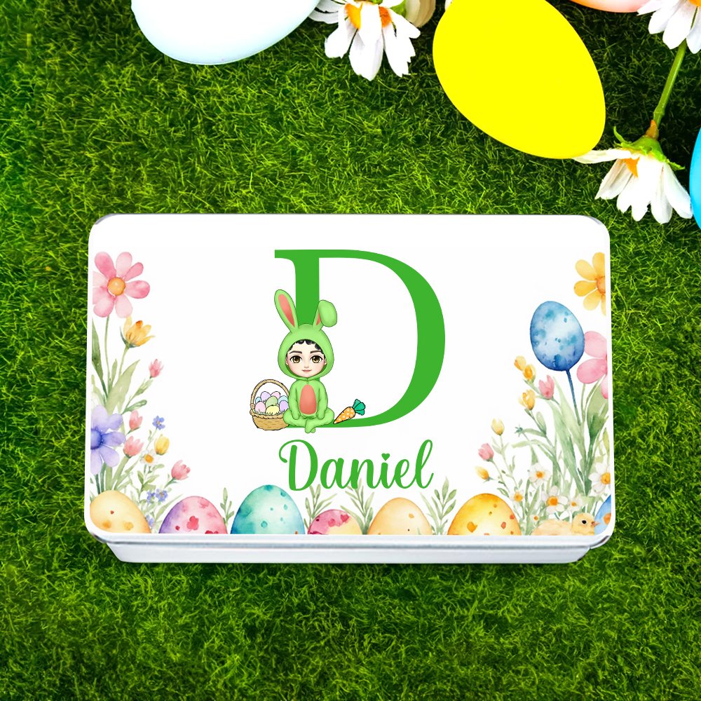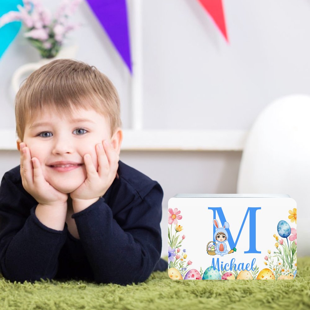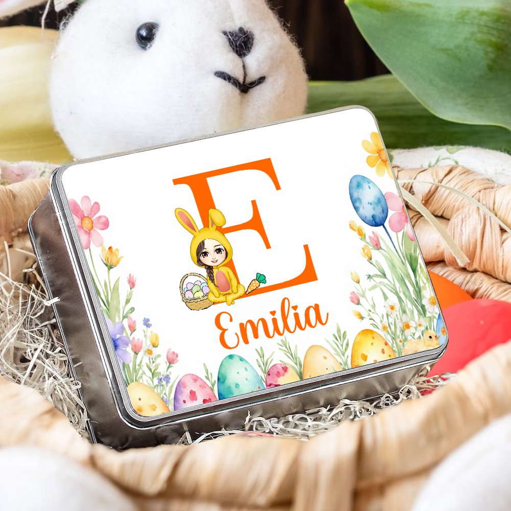 The surface of this biscuit box is printed with bunny costume characters and letters, making it a unique and personal biscuit box for boys and girls alike. Its vibrant colors and playful cartoon design will capture the imagination of any child, making it a must-have item for Easter celebrations! The box's surface can also be customized with a name to make the gift feel more personal.