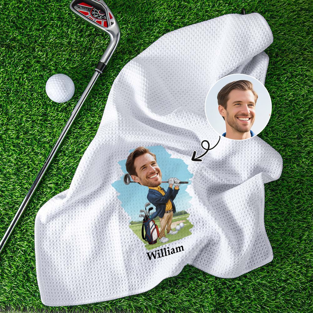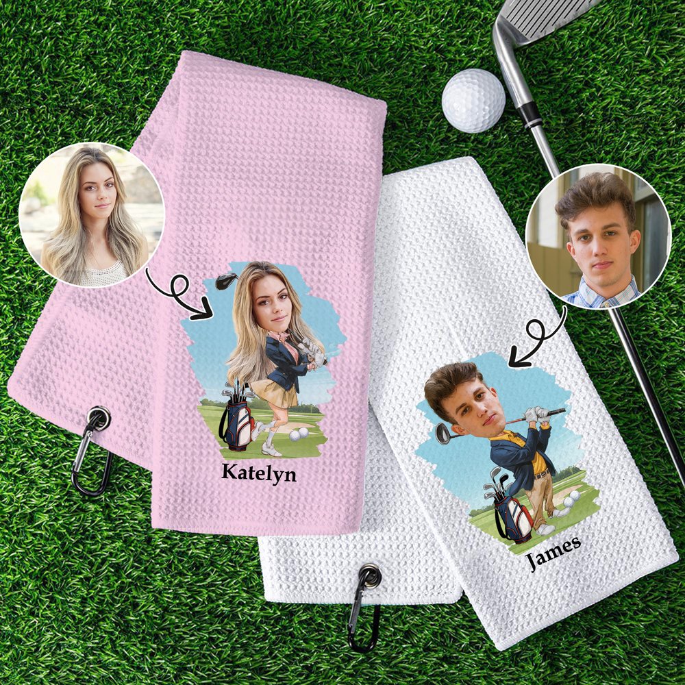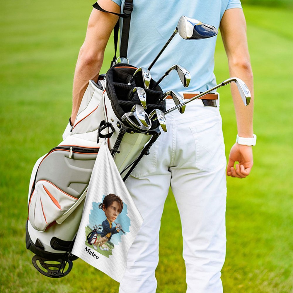 This golf towel features a cartoon character as its primary design. Upload a clear photo and we'll customize it with your chosen gender and skin tone. Your name will also be printed on the towel, creating a unique and personalized golf accessory. The playful cartoon style allows you to express your personality and easily attract attention on the course.
