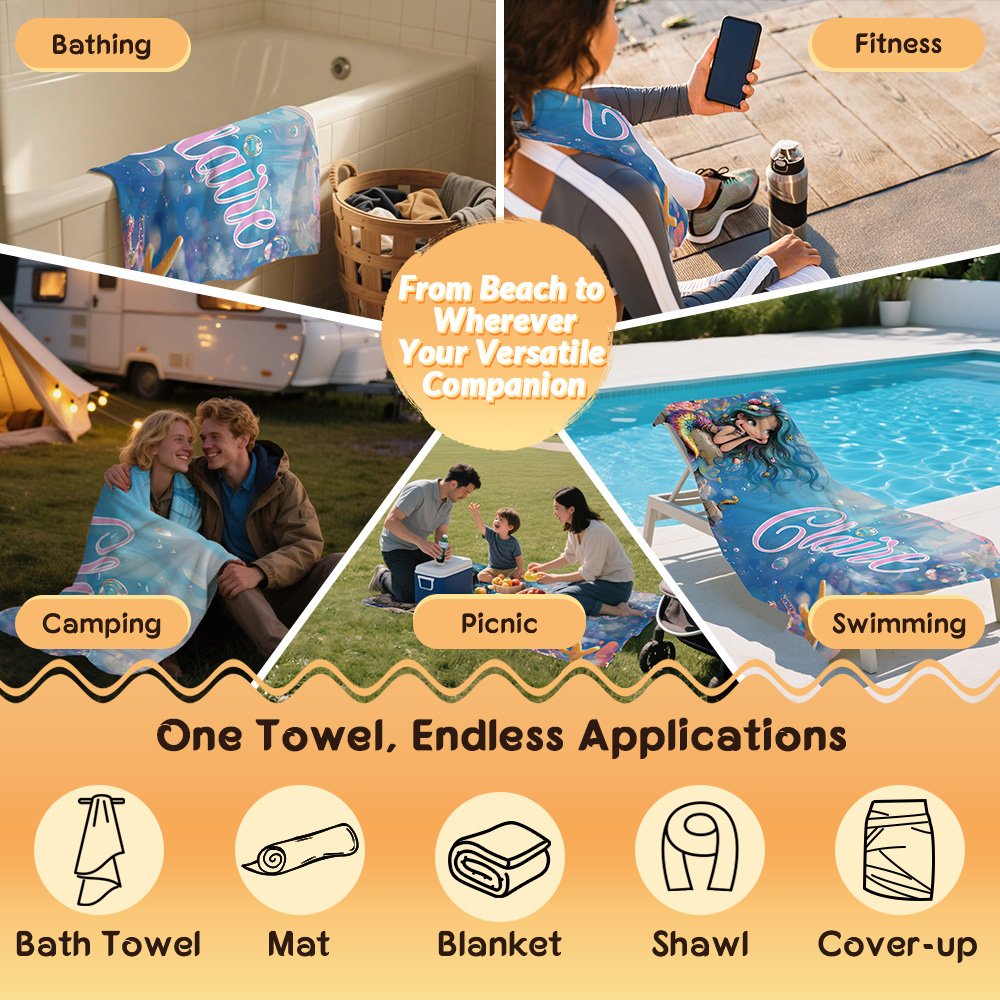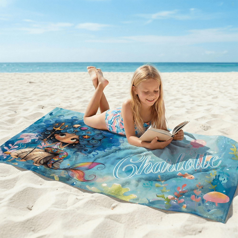 This beach towel features a mysterious and romantic cartoon mermaid design as its core element, showcasing a unique visual style. The vibrant colors vividly depict the enchanting world of mermaids, and the option for personalized names adds an artistic touch, allowing every beachgoer to express their taste and individuality.