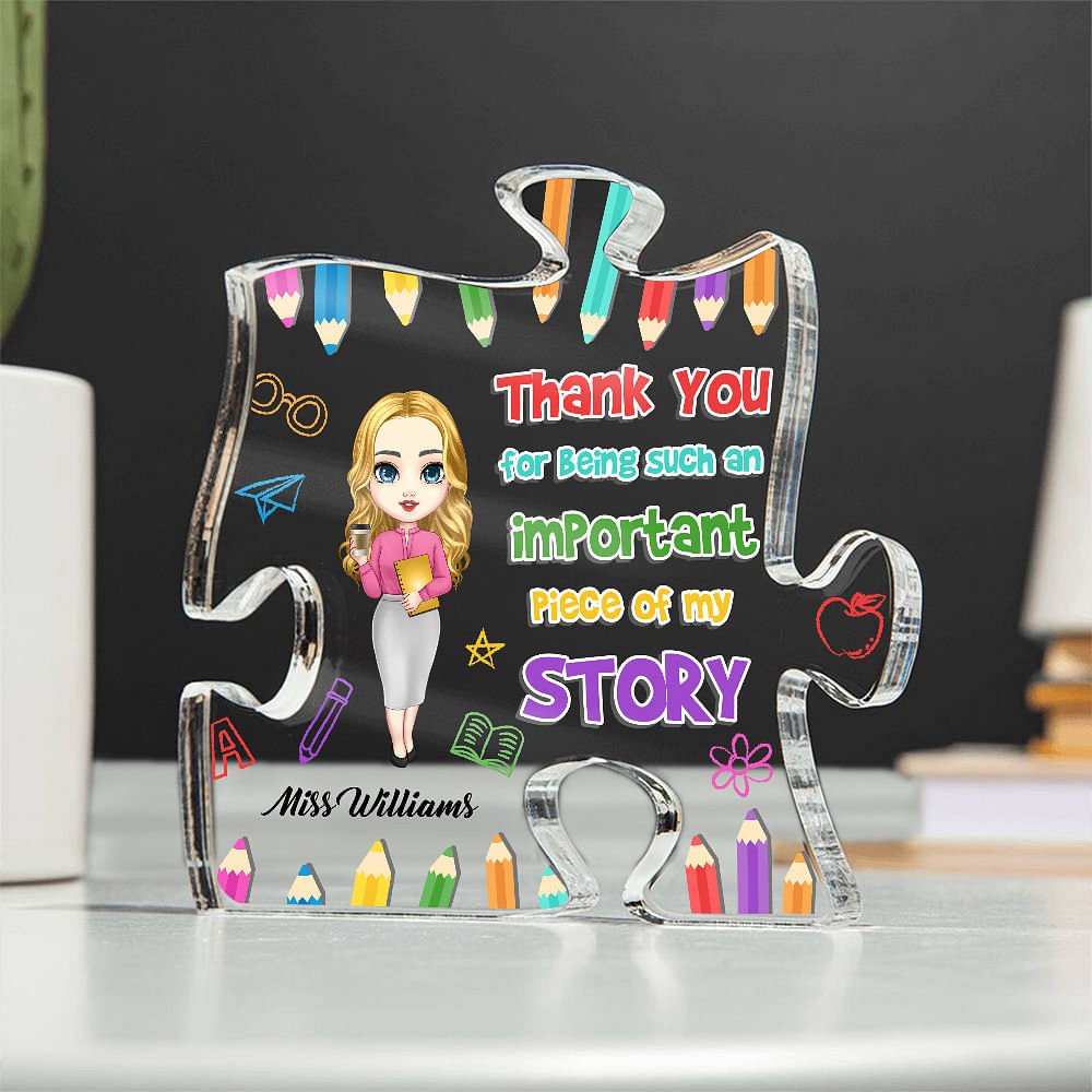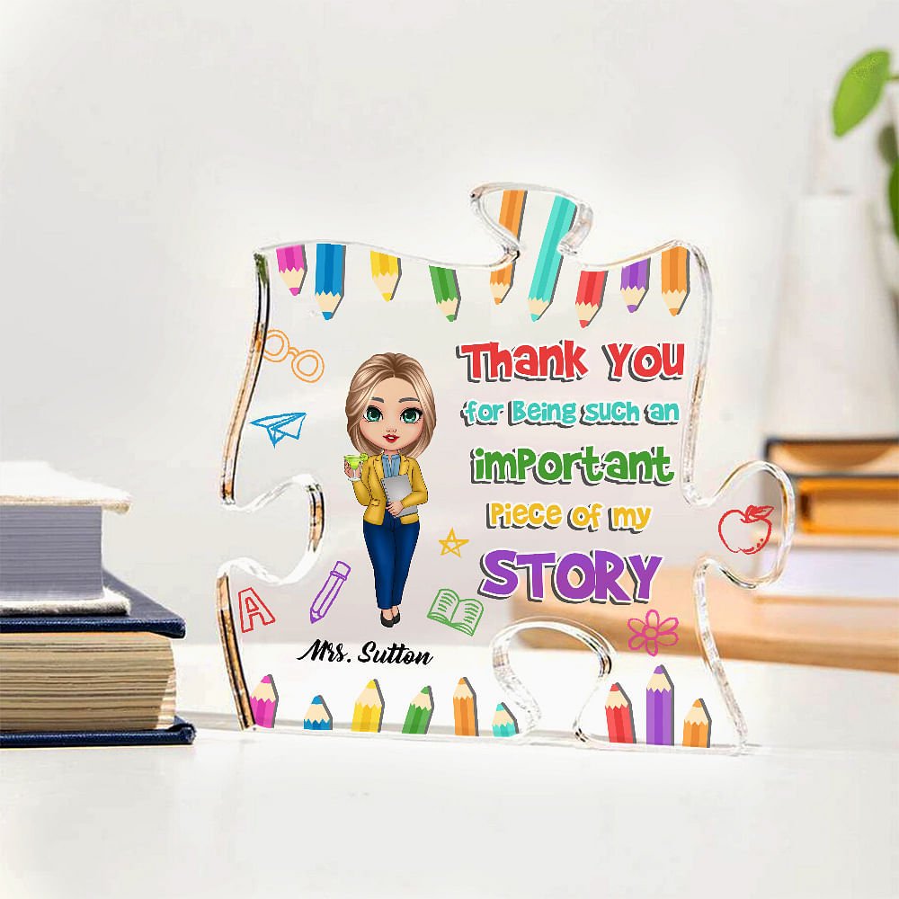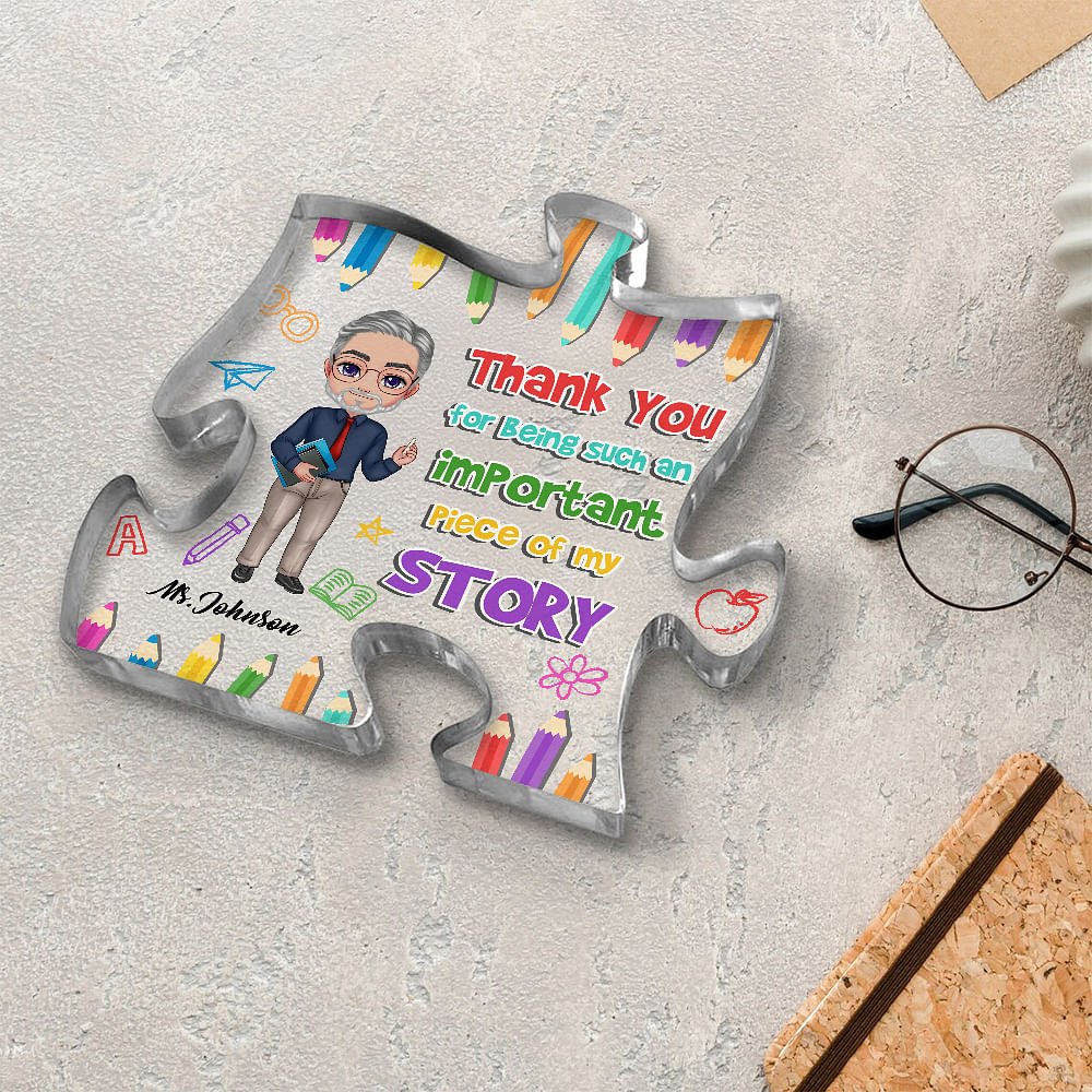 This cartoon pencil acrylic puzzle plaque has a colorful stationery pattern. It can be customized with the image of a cartoon teacher and the teacher's name, making this gift a unique Teacher's Day surprise. The plaque says, "Thank you for being such an important piece of my story." This warm sentence deeply expresses the students' gratitude for the teacher's selfless dedication.