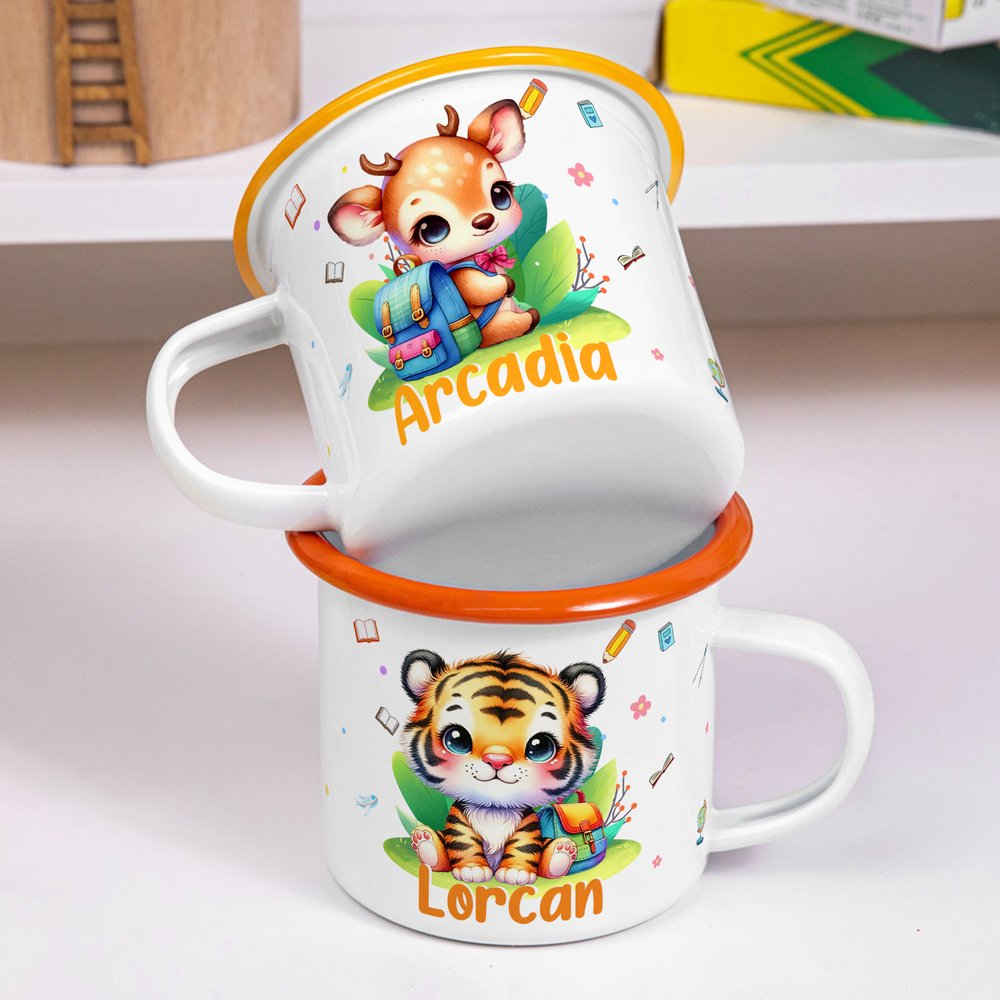 This 12 oz enamel mug has a cute and playful design. The enamel mug body is printed with patterns of small animals carrying backpacks to school. It can also be customized with names. It is paired with a macaron-colored mug rim. It is cute and unique, making kids love it and allowing adults to regain their kidlike innocence.