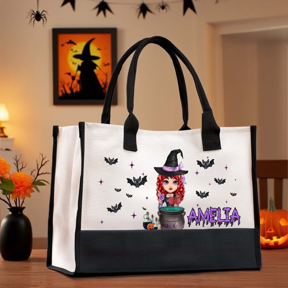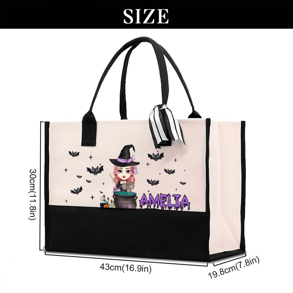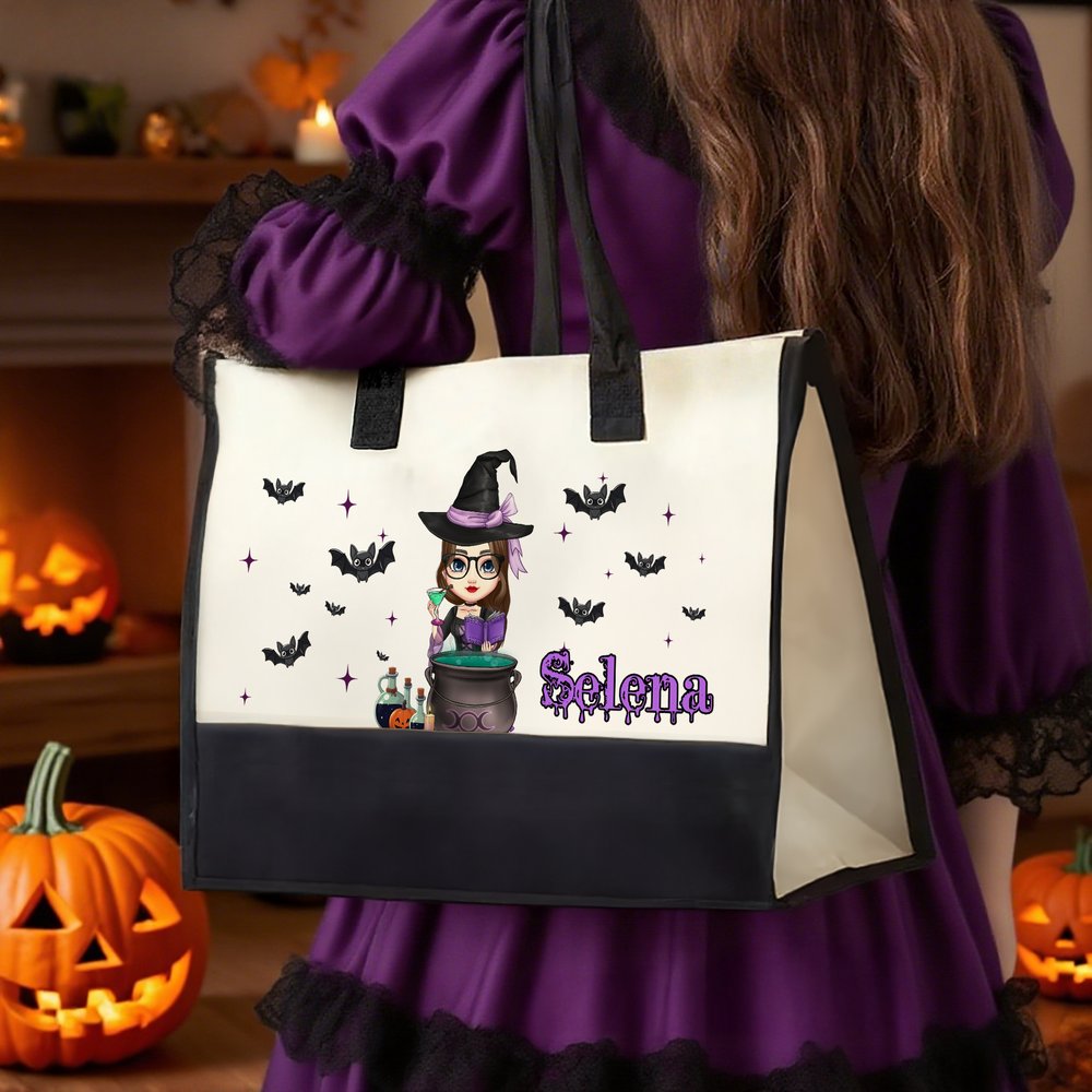 This tote bag has Halloween as its core theme, perfectly integrating cute cartoon witch images with exclusive customization, becoming an eye-catching item during the festival. The classic white and black tote bag comes with a Halloween atmosphere, adorned with patterns such as stars, bats, and magic potions. The most thoughtful feature is the customization of exclusive names, which can be printed next to the witch image, making each bag a unique "identity identifier".