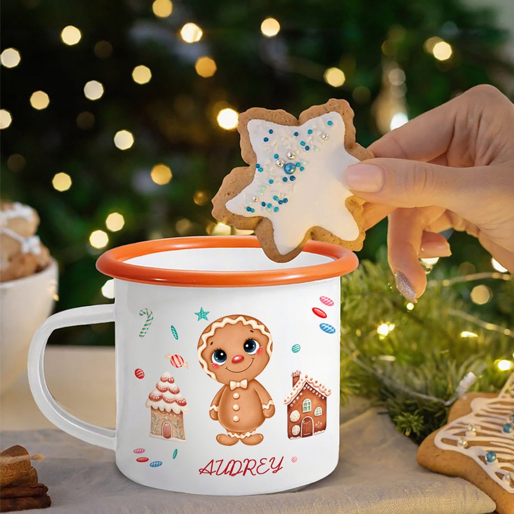 The mug features adorable gingerbread men, candies, and gingerbread houses printed on its body, paired with customizable names to blend festive cheer with a personal touch. The vibrant rim adds visual interest, making it a warm symbol for the holidays.