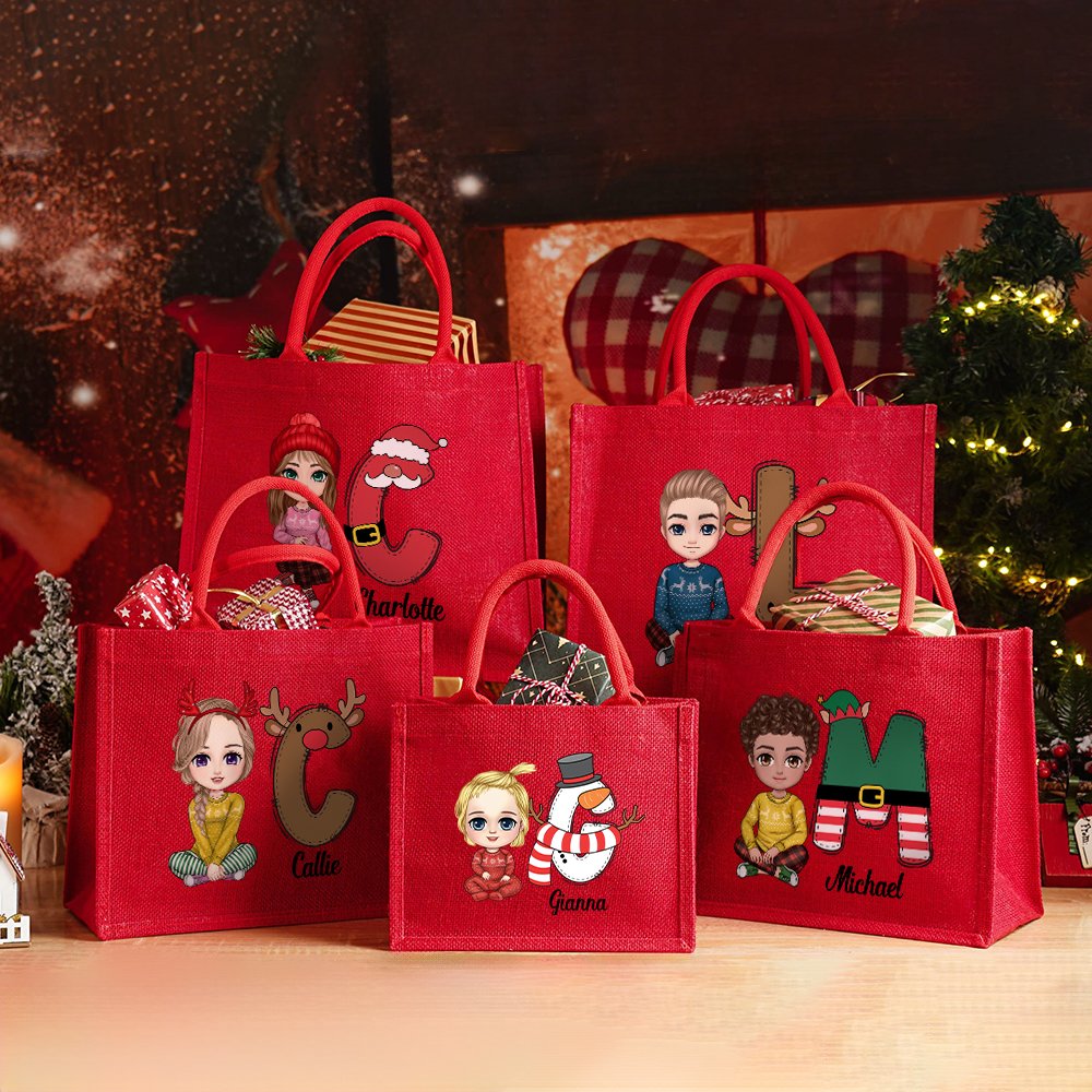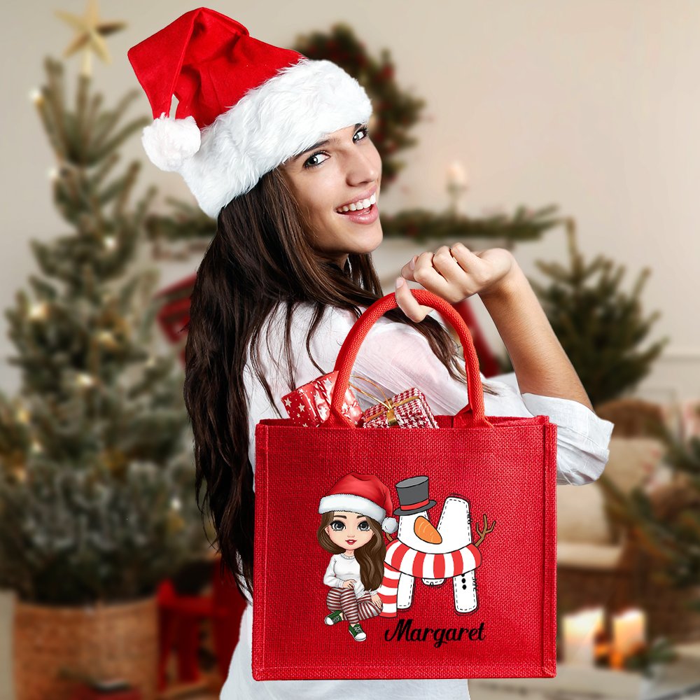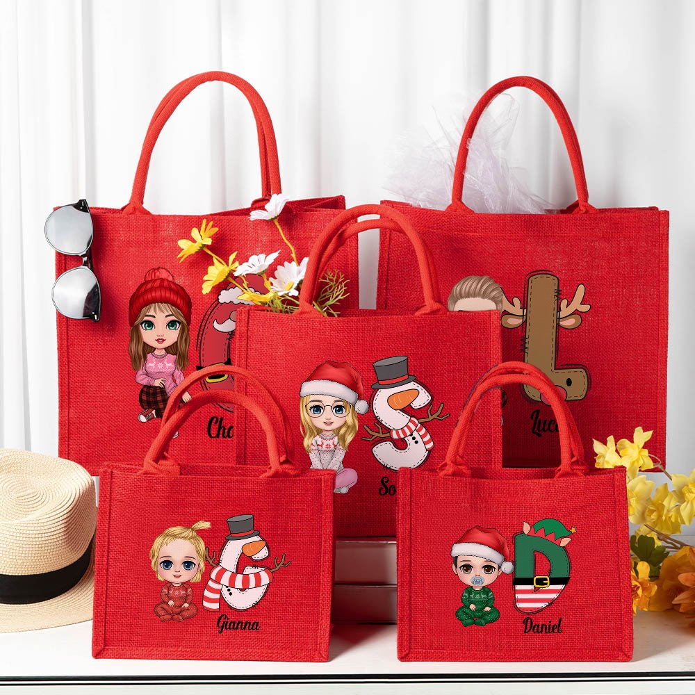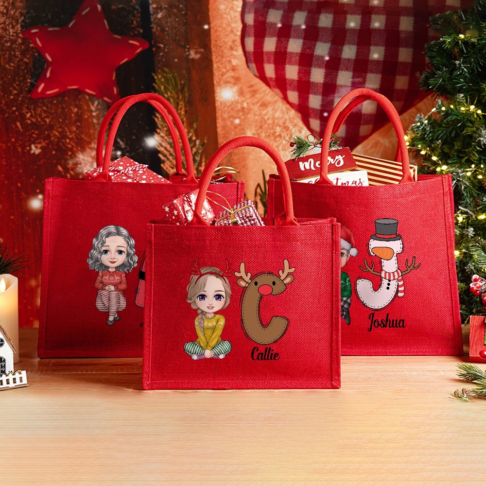 This red tote bag showcases a charming cartoon character alongside a playful holiday-themed initial, like the snowman, reindeer, monster, and Santa Claus style, creating a joyful and whimsical atmosphere. The red color is perfect for embracing the Christmas spirit; this bag will brighten up any celebration.
