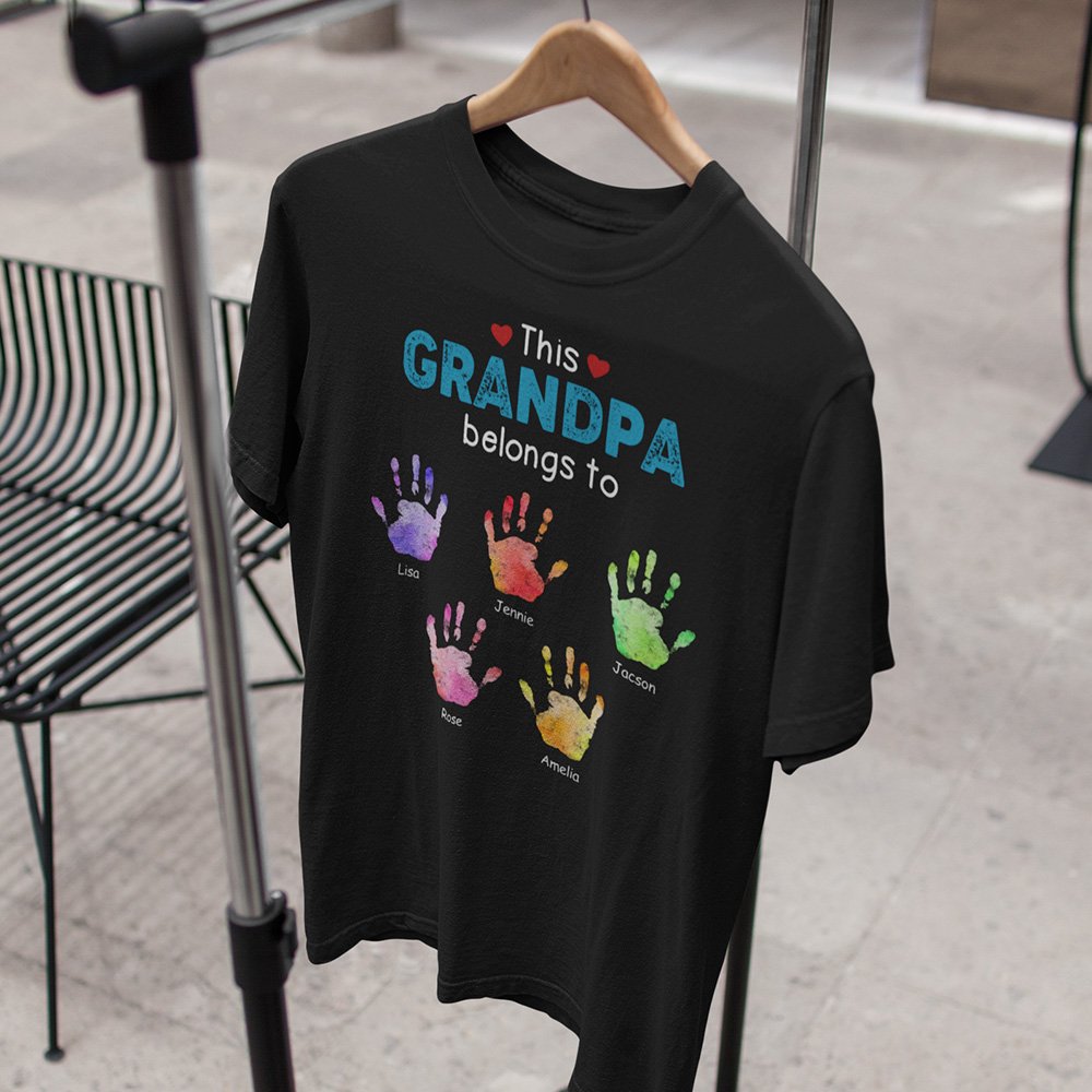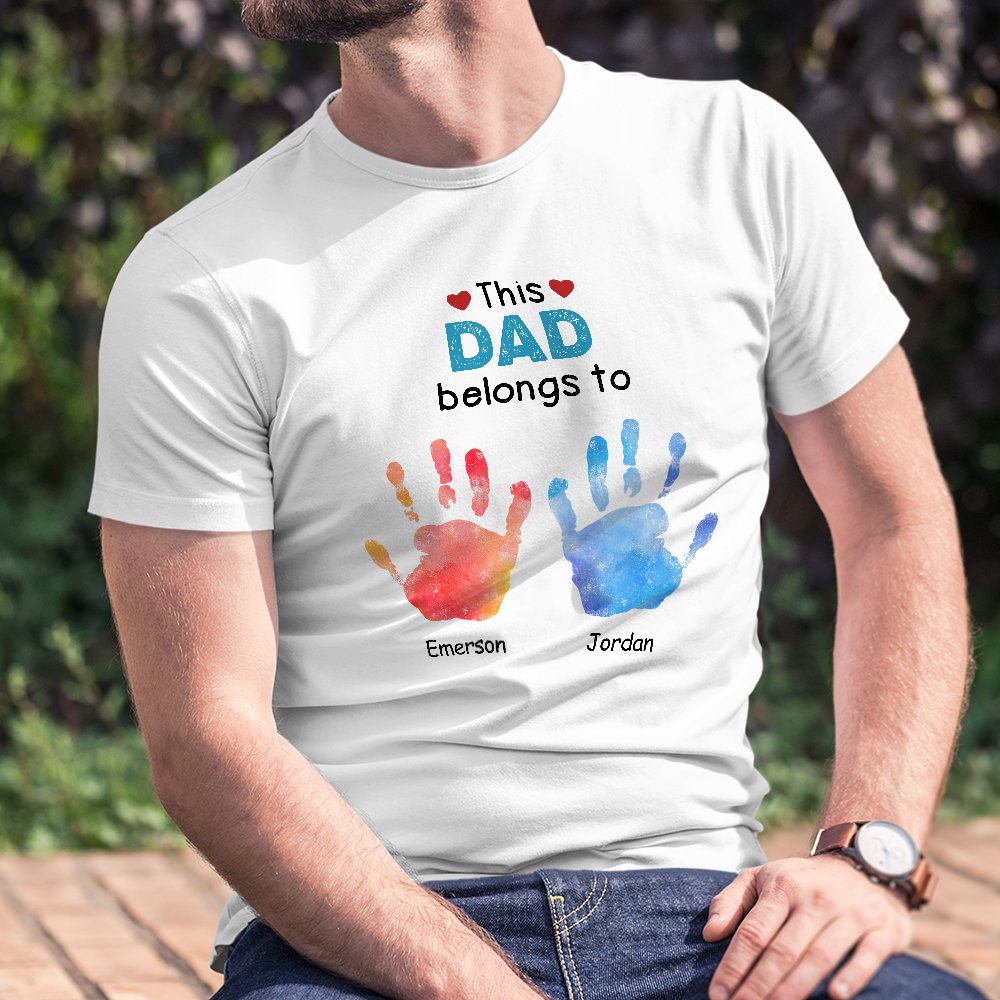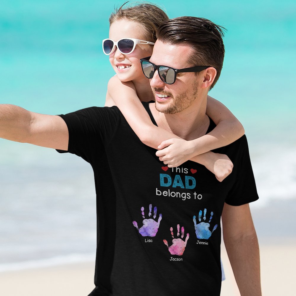 This T-shirt uses a watercolor hand design, each handprint records the warmth and intimacy of family members, and each name represents the deep emotion between family members. The phrase "BELONGS TO" highlights the special status of the father or other family members in the family, so that the father can feel the love and respect of his family when he wears the T-shirt.