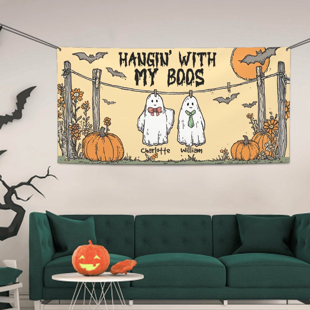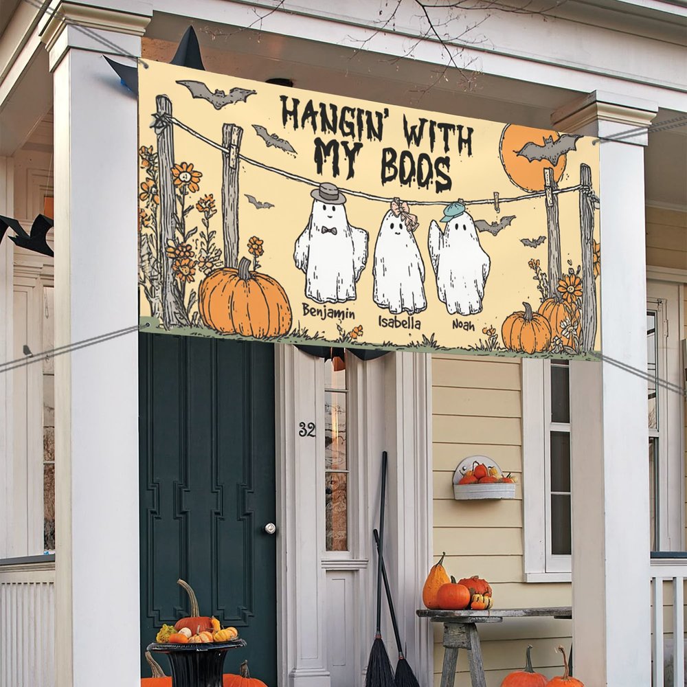 Centered around classic Halloween elements like ghosts and pumpkins, this design supports customization with 1-6 ghosts and a personalized name. The overall style radiates mysterious fun and festive spirit. The ghosts are playfully animated, while pumpkin motifs reinforce the Halloween theme. Adding a custom name transforms the banner into a unique decorative emblem—quickly setting the festive mood with Halloween elements while showcasing individuality through bespoke design.