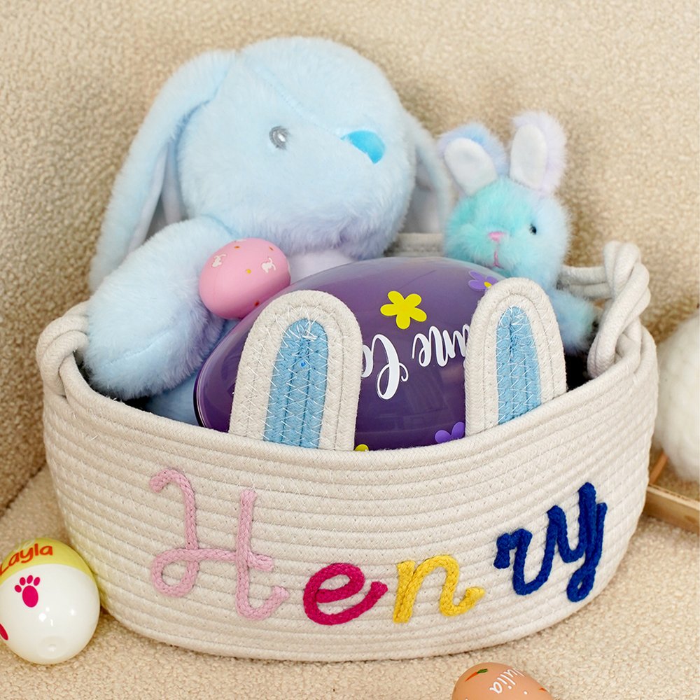 This woven basket features an adorable Easter bunny design, adorned with woven bunny ears and the baby's name woven in colorful cords, making it a unique piece that instantly brightens the holiday atmosphere.