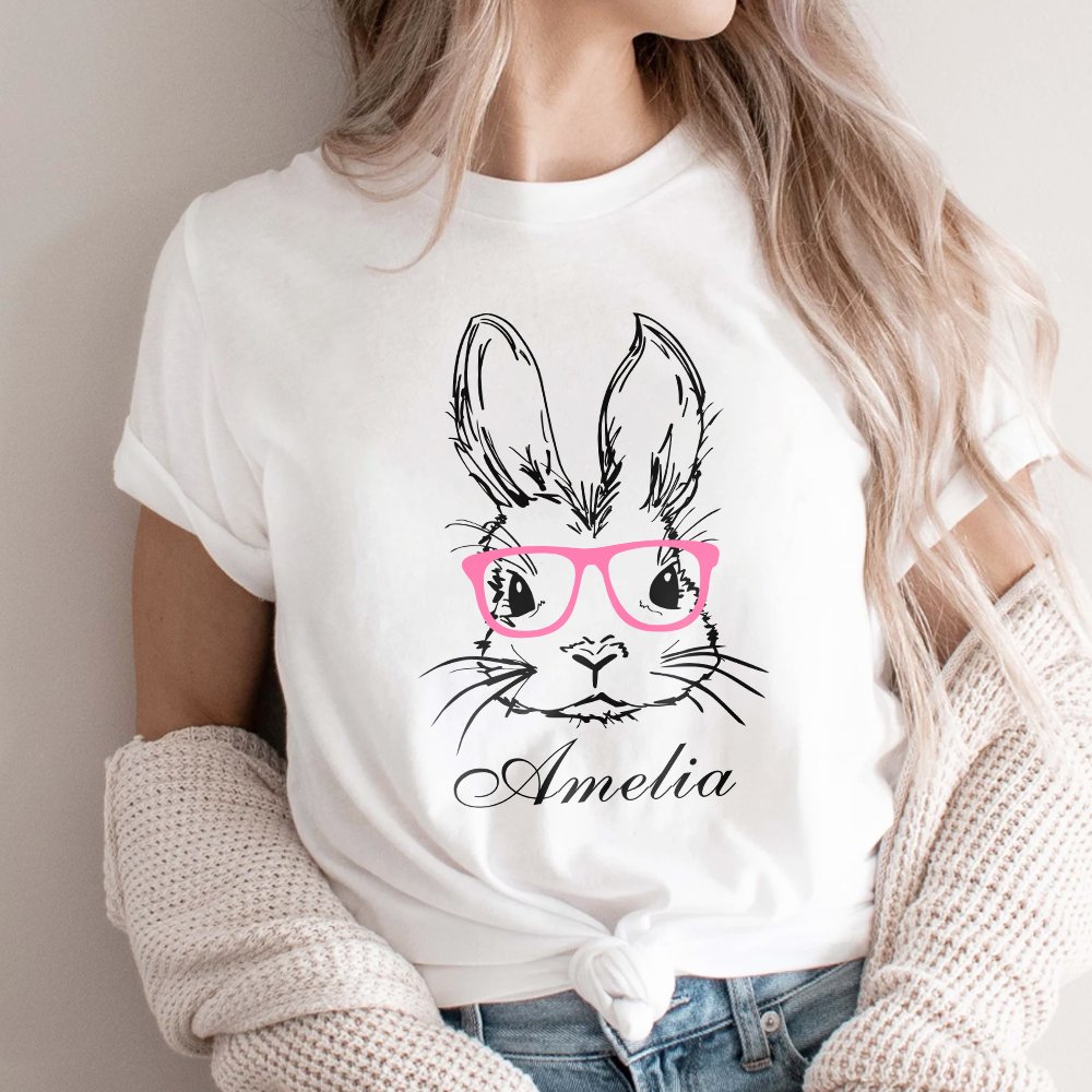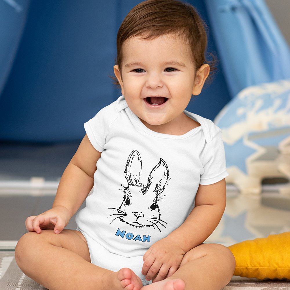 The apparel features an adorable bunny pattern that perfectly captures the essence of Easter. A name can be customized underneath the pattern, which is a great way to create a truly unique and personalized Easter outfit.
