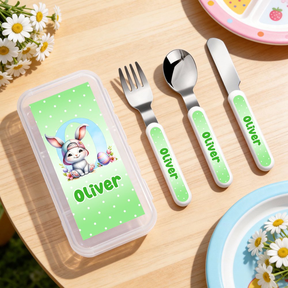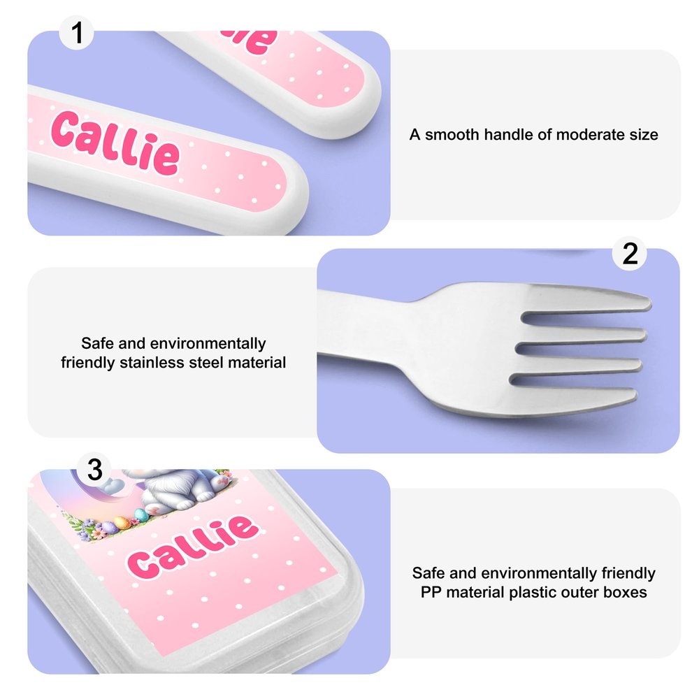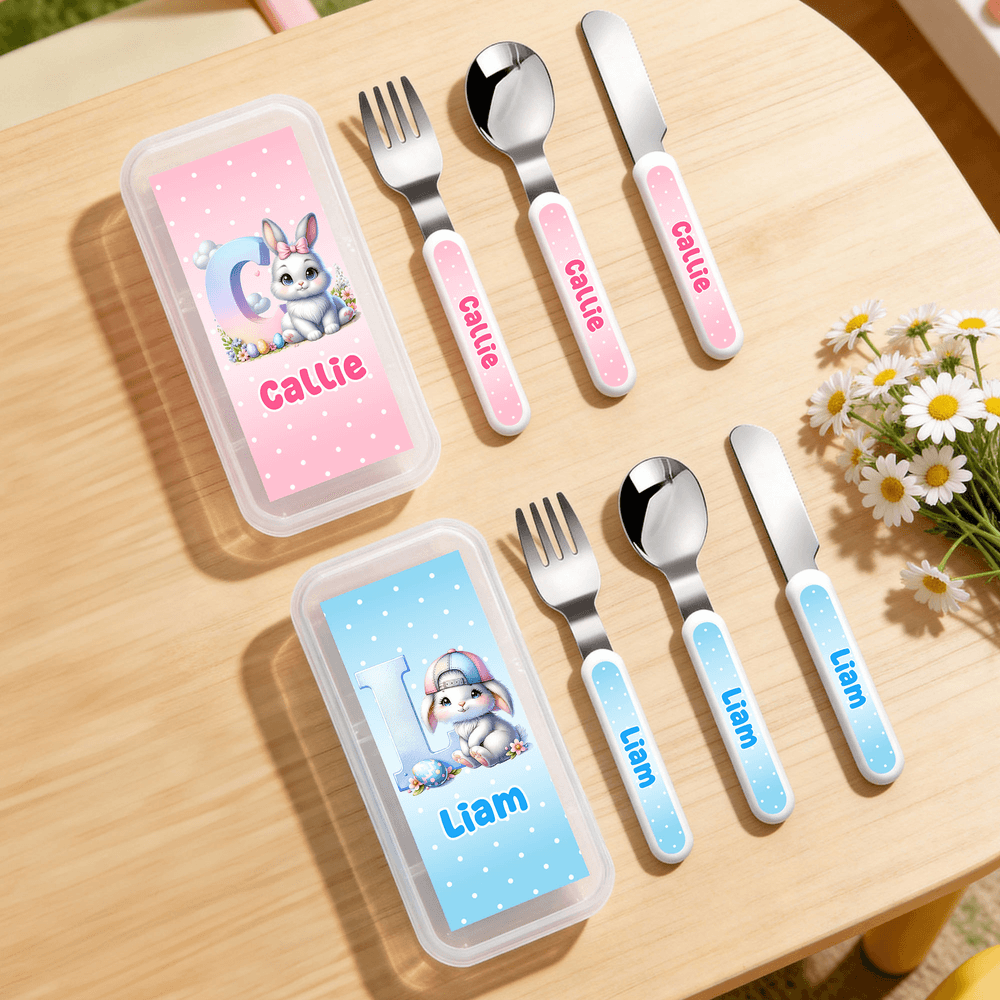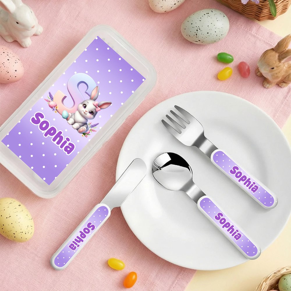 Featuring a cute pink-and-blue cartoon Easter bunny as the central theme, paired with a fresh, delicate polka-dot background, and personalized with the child's name in a rounded, playful font (two colors available), this product creates a charming Easter atmosphere that will make children love their special mealtime.