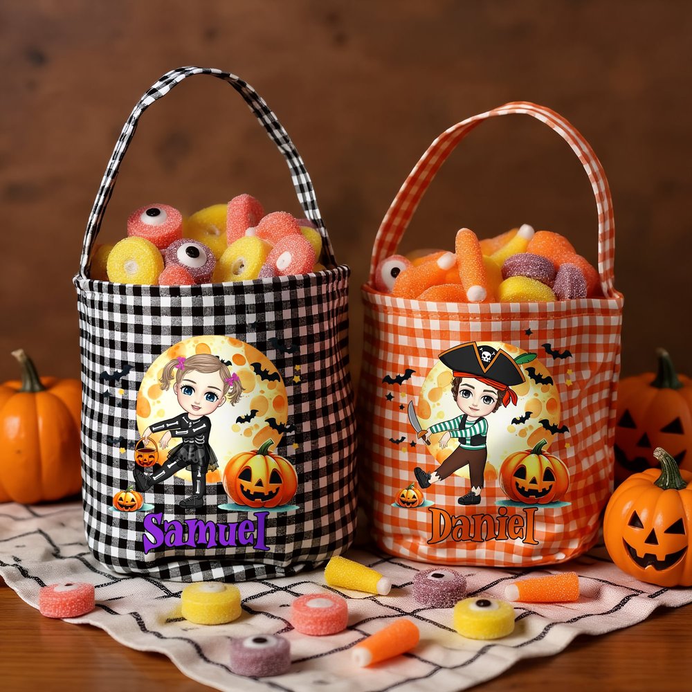The design can incorporate cartoon character images, paired with Halloween elements like pumpkins, bats and moon background. You can choose cute costumes, such as a skeleton outfit, a pirate suit and add your child’s name, turning the candy basket into a one - of - a - kind holiday “treasure bag”.
