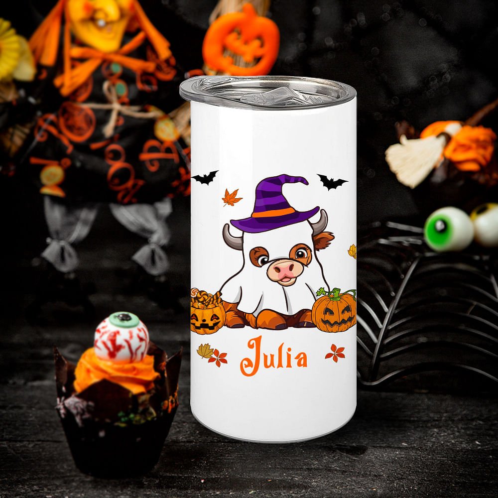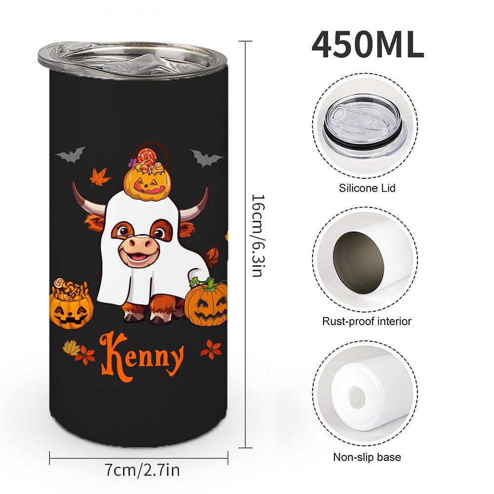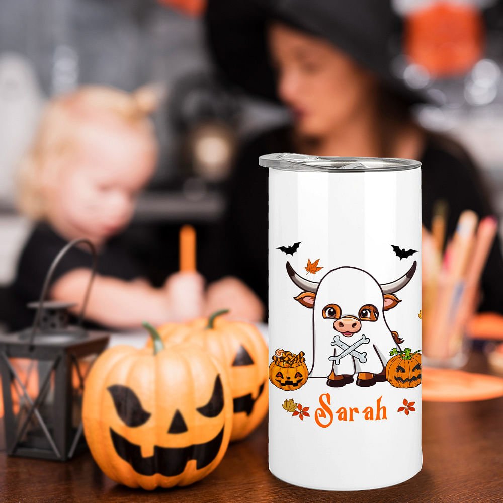 Our tumbler is uniquely designed, combining ghosts with Highland cattle to create a cute, Halloween-style design. There are 8 different styles, capturing highland cattle's different movements and expressions, showing cute, playful, elegant, childlike, and other styles. The child's name can be printed on the front, which is also a way to express personality.