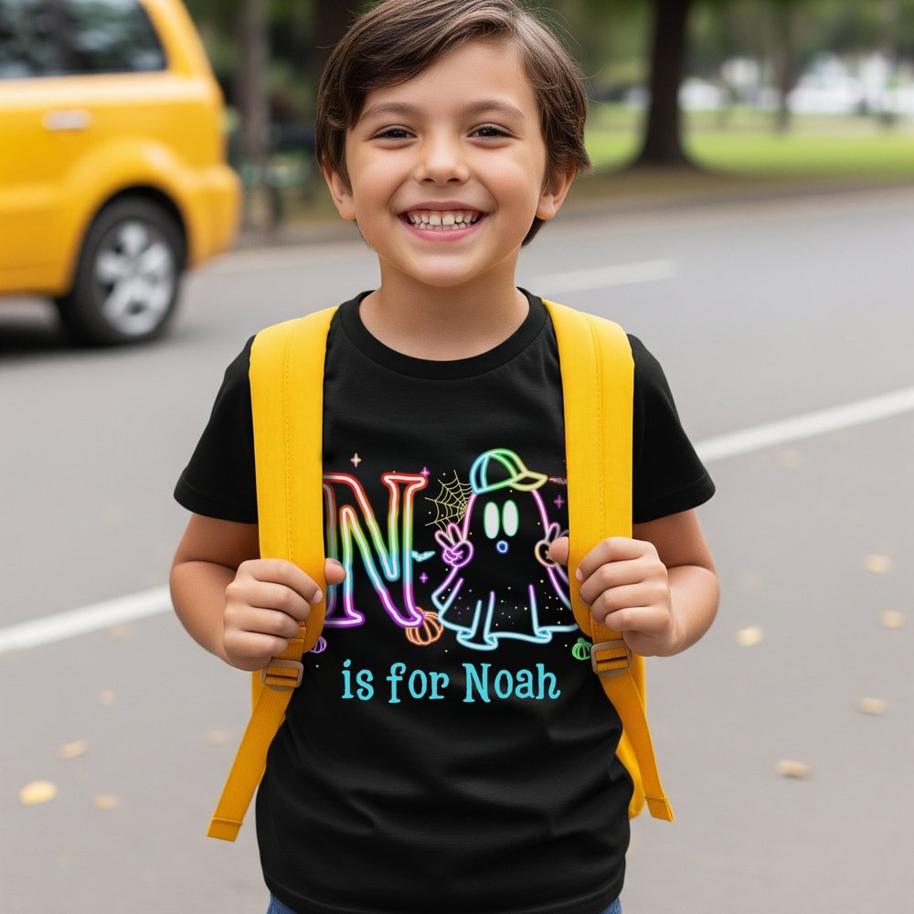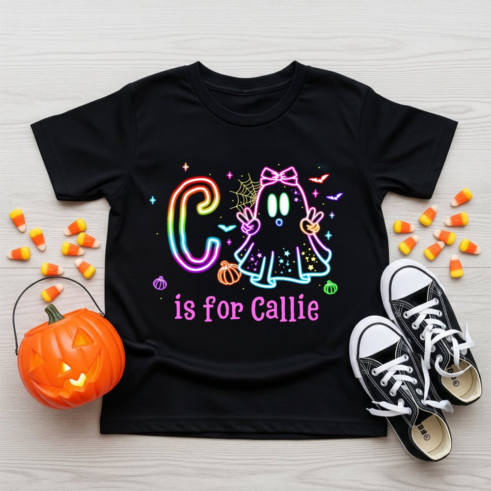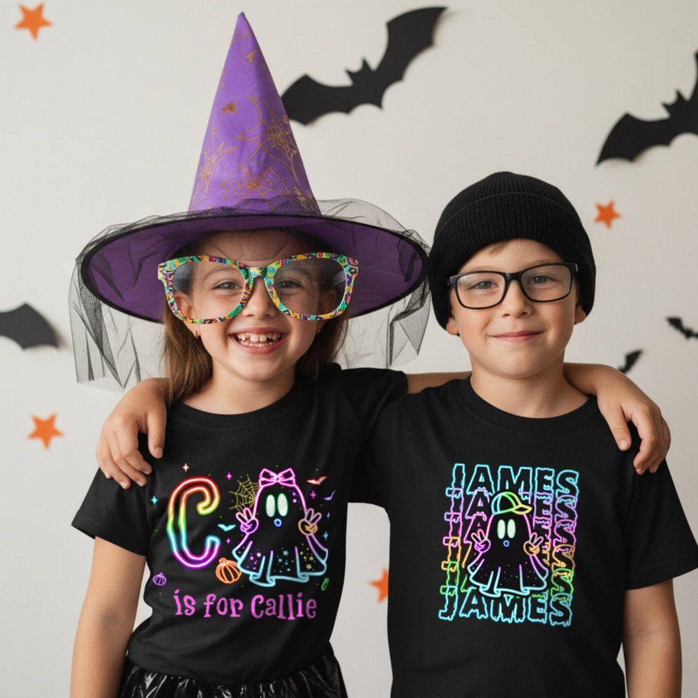 Featuring a cute neon ghost as the core element, this design features a customizable name design and is available in two styles. This clever blend of vibrant colors and playful ghost graphics, complemented by Halloween elements like stars and bats, makes both a T-shirt and a sweatshirt a unique and eye-catching addition to any occasion, making them a standout.