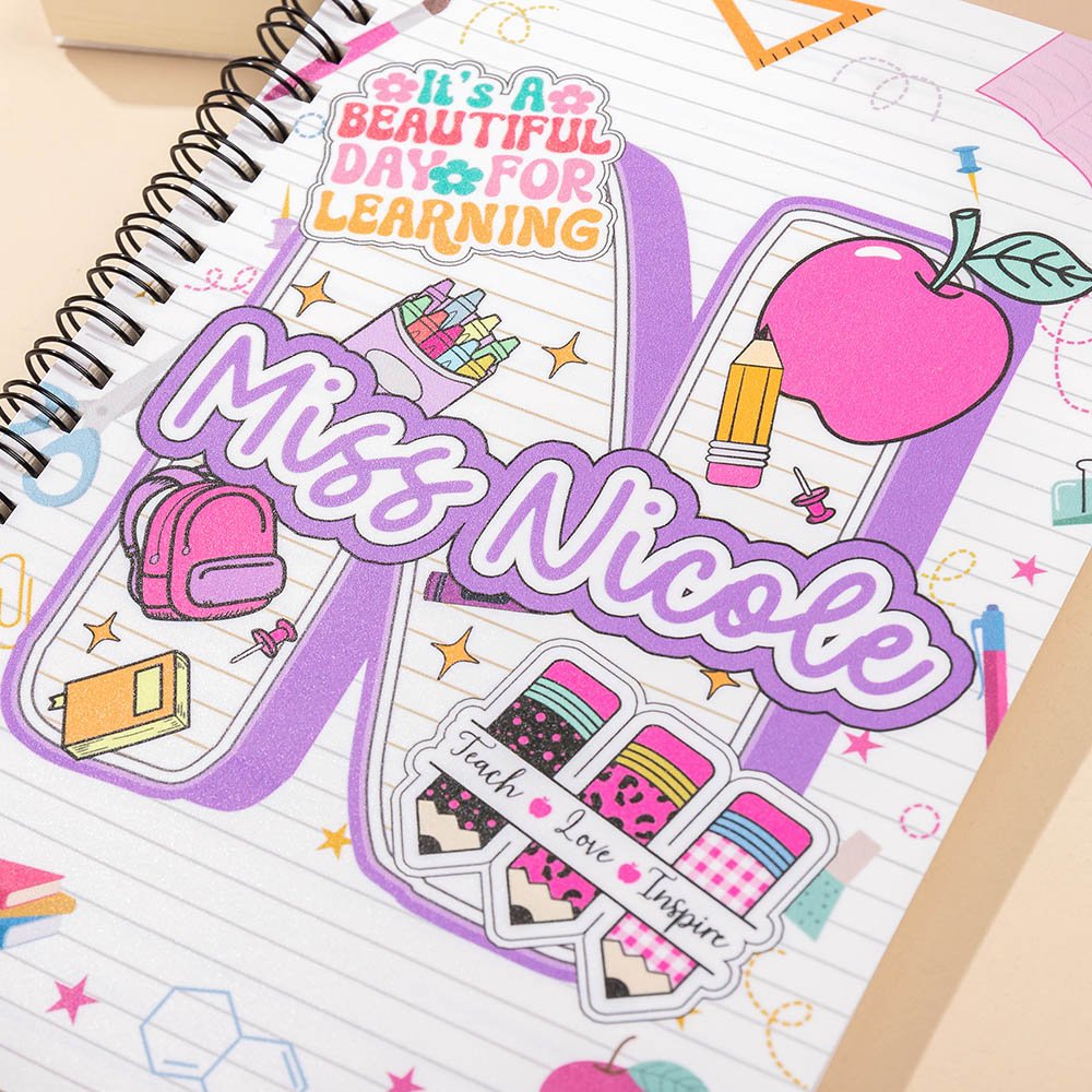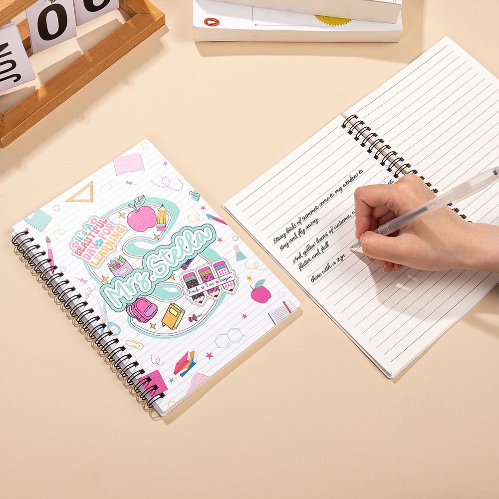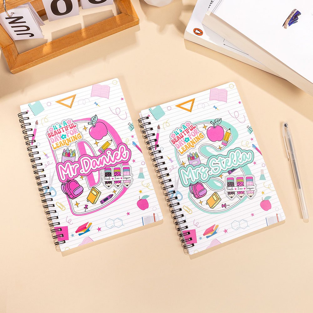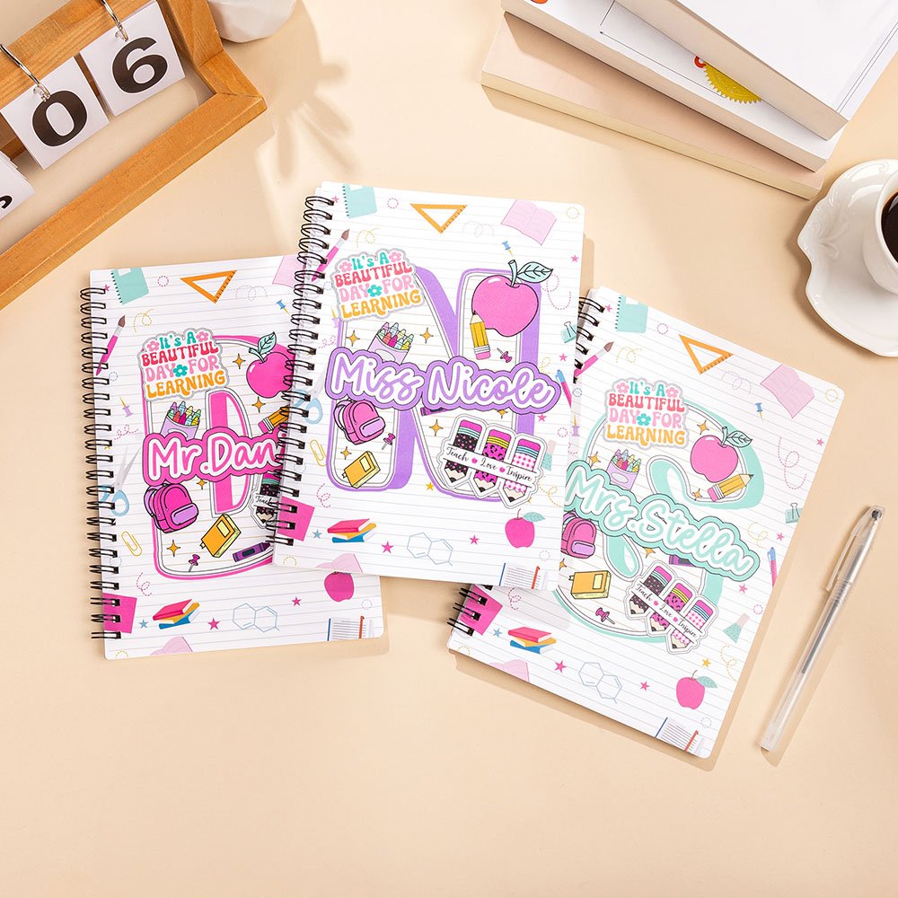 The cover of this notebook features various cute cartoon elements such as apples, pencils, backpacks, and notebooks, making it both fashionable and fun. It also features the phrases "It’s A Beautiful Day For Learning" and "Teach love Inspire," creating a joyful learning atmosphere. Additionally, the letters and names on the notebook can be customized. You can provide your own name to create a unique and perfect notebook tailored just for you.
