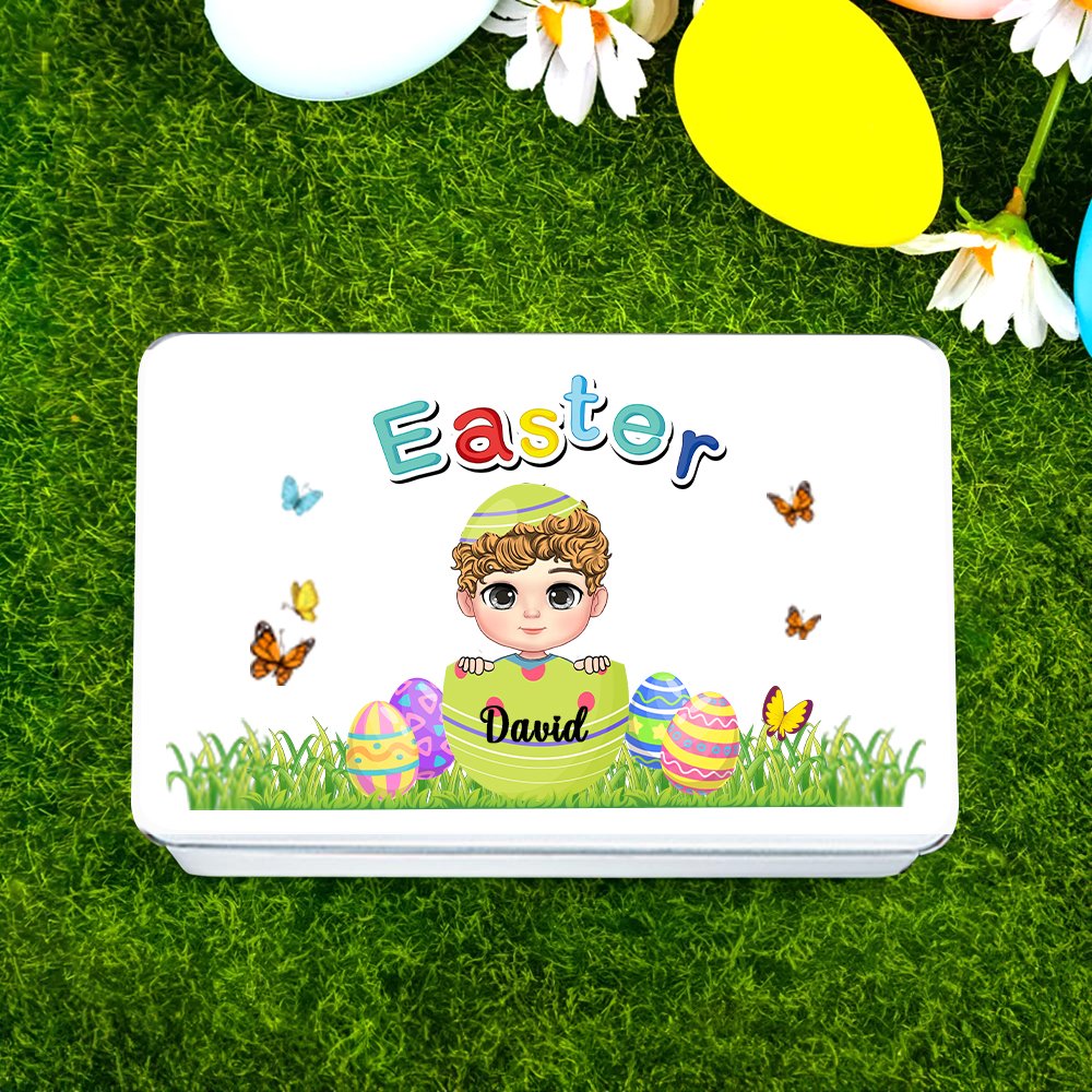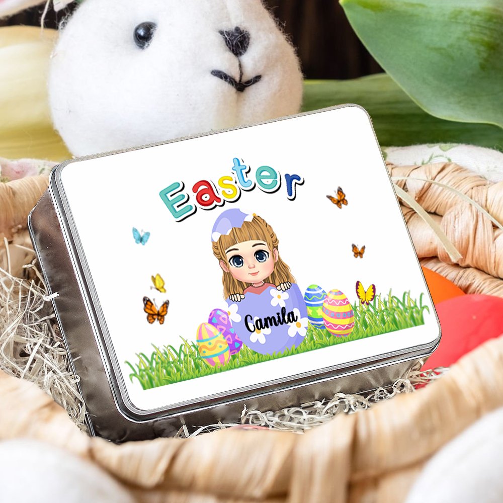 The surface of this biscuit box is printed with a lovely cartoon character egg pattern, which is colorful and vivid. The shape of the egg is then matched, which is full of children's interest and creativity. The surrounding green grass, yellow flowers, and flying butterflies add to the atmosphere of spring. The box's surface can also be customized with a name to make the gift feel more personal.