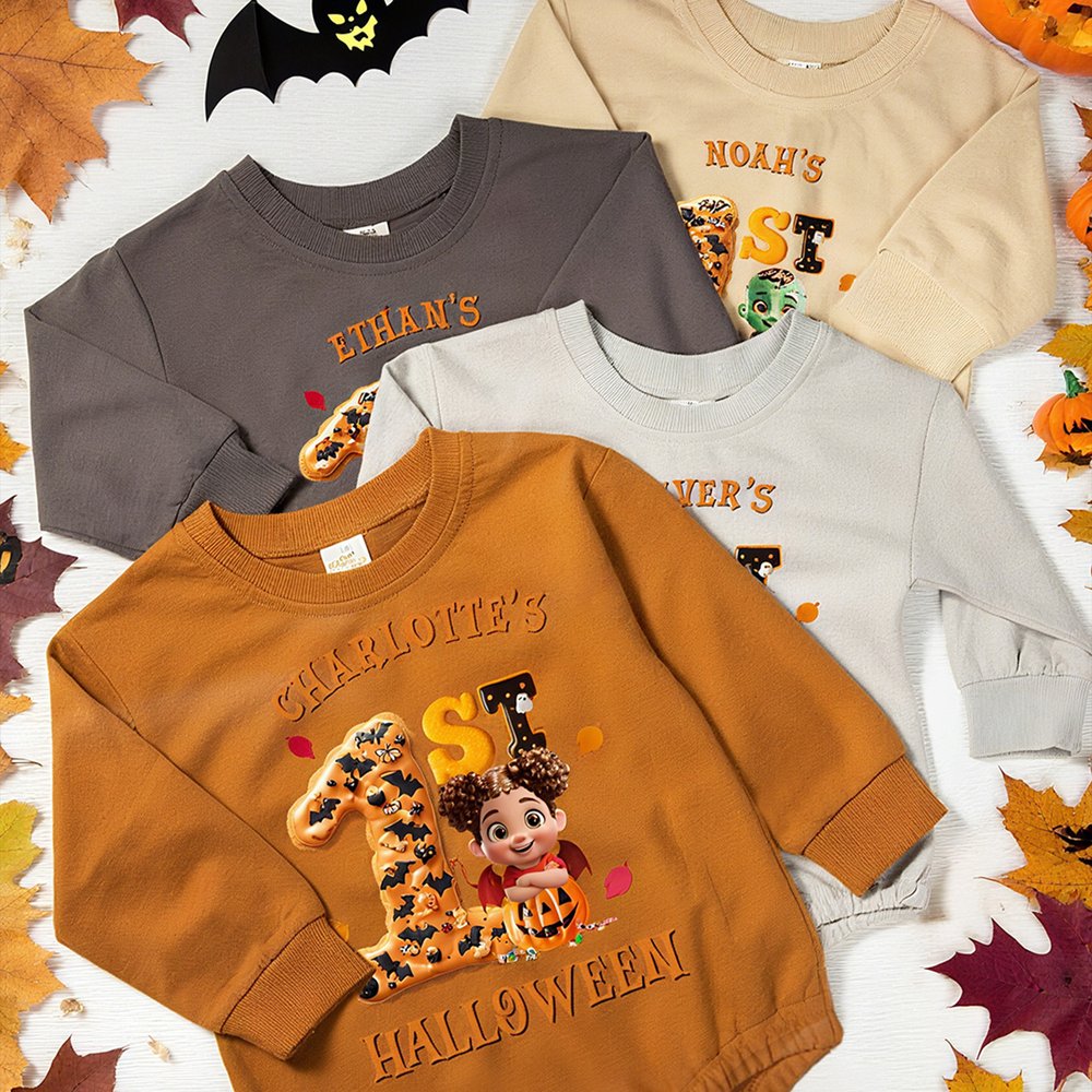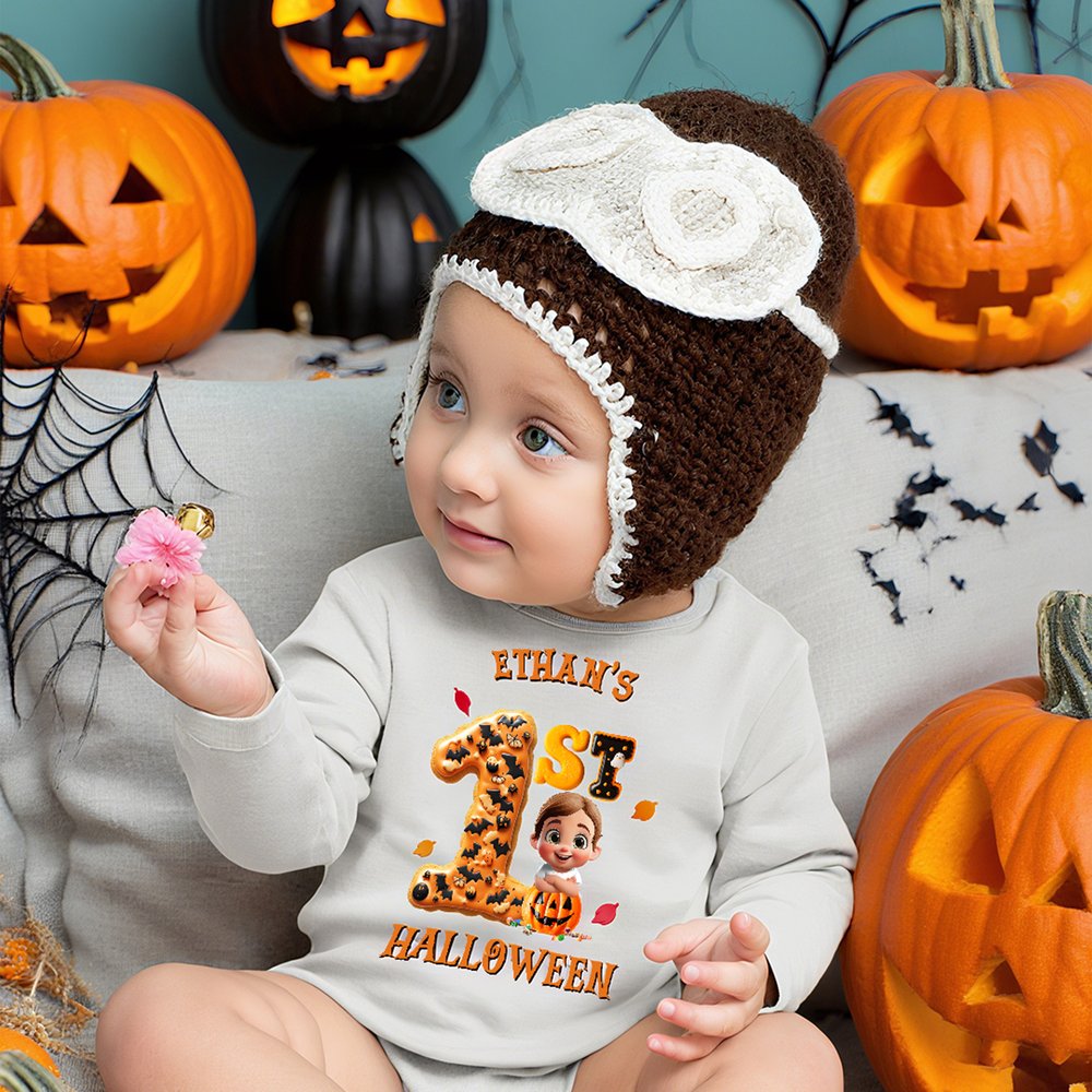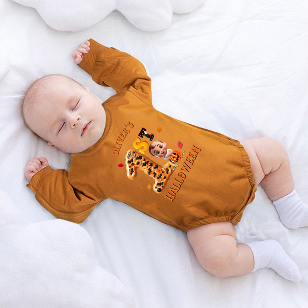 Centered around the concept of “Baby's 1st Halloween,” this design incorporates classic Halloween elements like falling leaves, candy, and pumpkins. Paired with an adorable cartoon style, the overall look brims with childlike charm and festive spirit. Customize with your baby's name to transform this crawling suit into a unique keepsake, capturing a milestone in their growth journey.