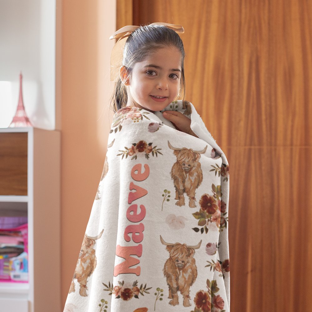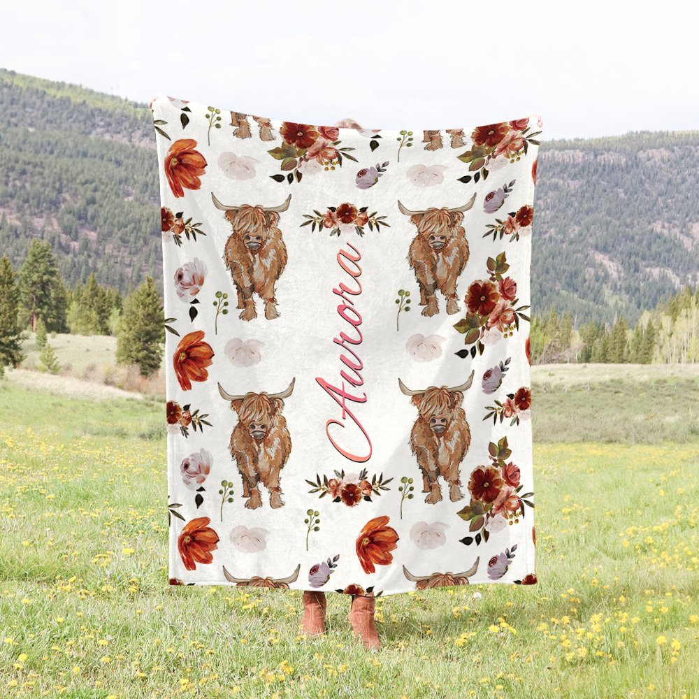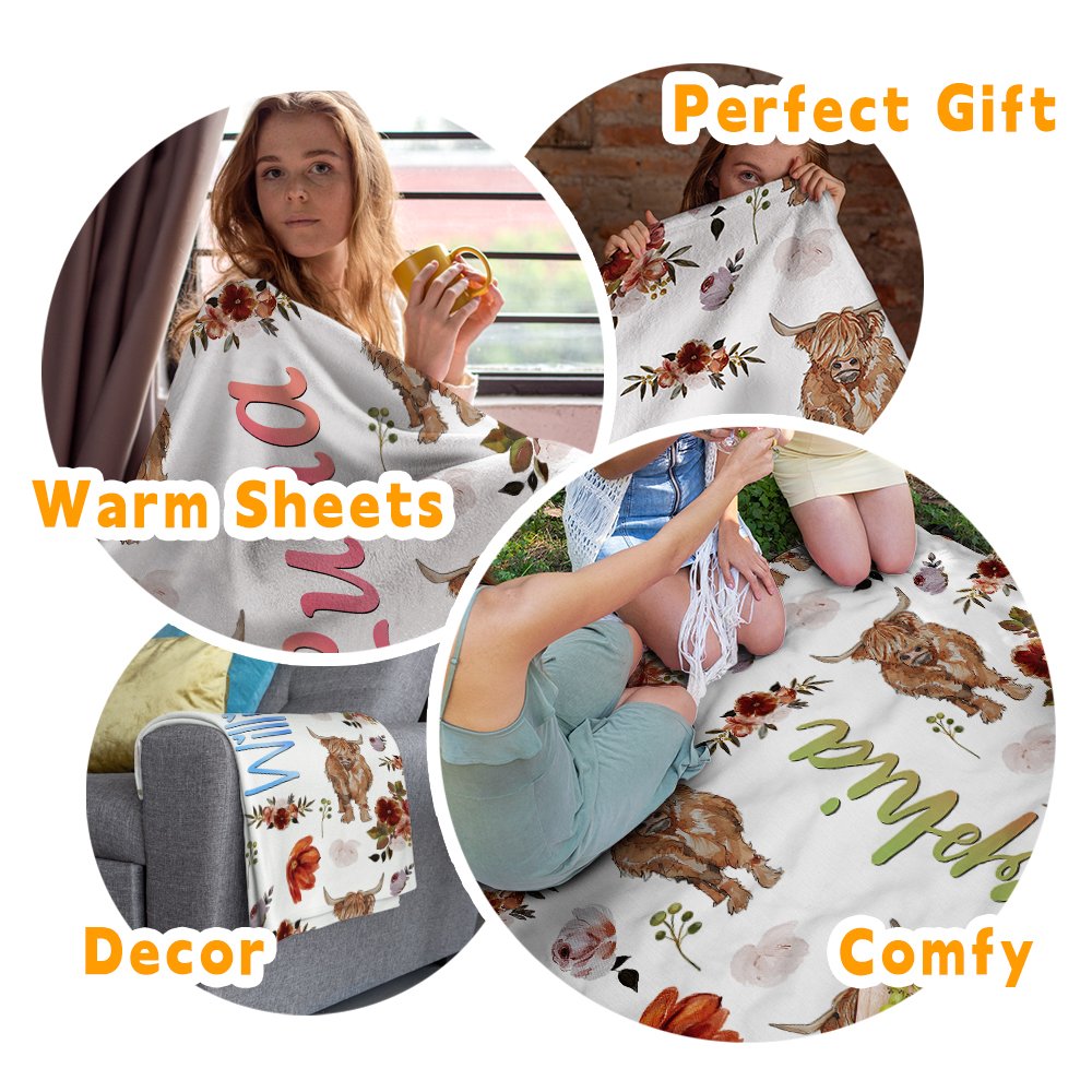This adorable blanket is not only incredibly soft and cozy, but it also features a cute highland cow design and can be personalized with any name, making it ideal for Holiday Christmas, at parties, in the home, and children's rooms.